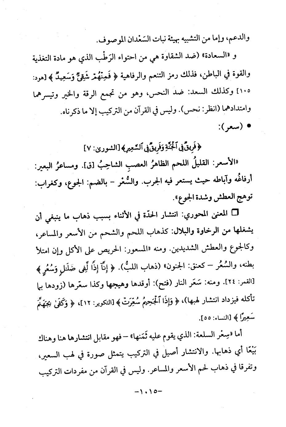 أما "سِعْر السلعة: الذي يقوم عليه ثَمَنها "- فهو مقابل انتشارها هنا وهناك بَيْعًا أي ذهابها. والانتشار أصيل في التركيب يتمثل صورة في لهب السعير، وتفرقا في ذهاب لحم الأسعر والمساعر. وليس في القرآن من مفردات التركيب