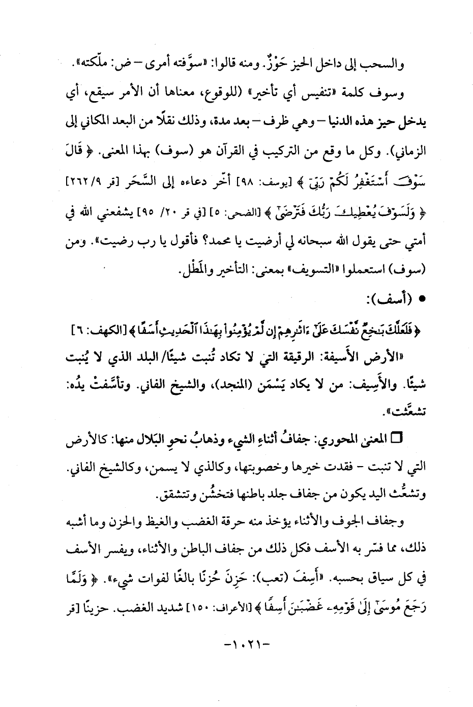 وجفاف الجوف والأثناء يؤخذ منه حرقة الغضب والغيظ والحزن وما أشبه ذلك، مما فسّر به الأسف فكل ذلك من جفاف الباطن والأثناء، ويفسر الأسف في كل سياق بحسبه. "أَسِفَ (تعب): حَزِنَ حُزنًا بالغًا لفوات شيء ". {وَلَمَّا رَجَعَ مُوسَى إِلَى قَوْمِهِ غَضْبَانَ أَسِفًا} [الأعراف: 150] شديد الغضب. حزينًا [قر