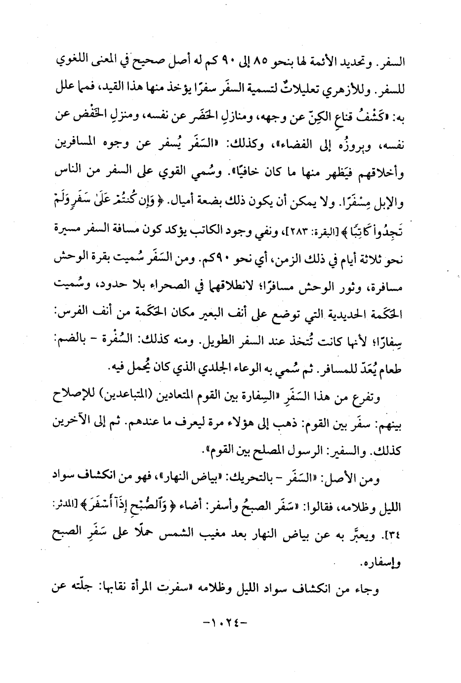 السفر. وتحديد الأئمة لها بنحو 85 إلى 90 كم له أصل صحيح في المعنى اللغوي للسفر. وللأزهري تعليلاتٌ لتسمية السفَر سفرًا يؤخذ منها هذا القيد، فمما علل به: "كَشْفُ قناعِ الكِنّ عن وجهه، ومنازلِ الحَضَر عن نفسه، ومنزلِ الخَفْض عن نفسه، وبروزُه إلى الفضاء "، وكذلك: "السَفَر يُسفر عن وجوه المسافرين وأخلاقهم فيَظهر منها ما كان خافيًا ". وسُمي القوي على السفر من الناس والإبل مِسْفَرًا. ولا يمكن أن يكون ذلك بضعة أميال. {وَإِنْ كُنْتُمْ عَلَى سَفَرٍ وَلَمْ تَجِدُوا كَاتِبًا} [البقرة: 283]، ونفي وجود الكاتب يؤكد كون مسافة السفر مسيرة نحو ثلاثة أيام في ذلك الزمن، أي نحو 90 كم. ومن السَفَر سُميت بقرة الوحش مسافرة، وثور الوحش مسافرًا؛ لانطلاقهما في الصحراء بلا حدود، وسُميت الحَكَمة الحديدية التي توضع على أنف البعير مكان الحَكَمة من أنف الفرس: سِفارًا؛ لأنها كانت تُتخذ عند السفر الطويل. ومنه كذلك: السُفْرة - بالضم: طعام يُعَدّ للمسافر. ثم سُمي به الوعاء الجلدي الذي كان يُحمل فيه.