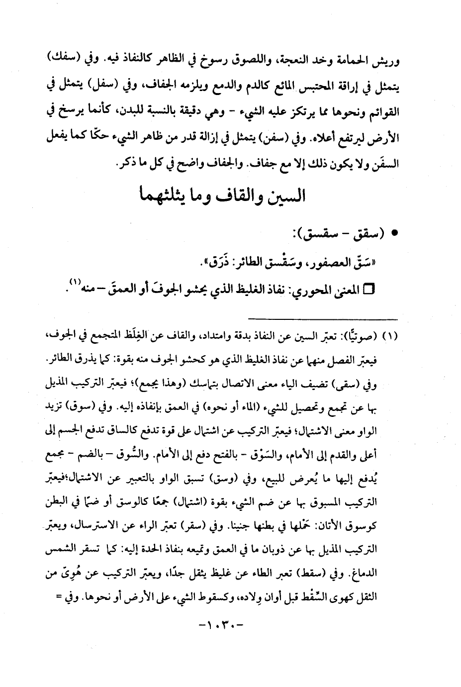 (¬1) (صوتيًّا): تعبّر السين عن النفاذ بدقة وامتداد، والقاف عن الغِلَظ المتجمع في الجوف، فيعبّر الفصل منهما عن نفاذ الغليظ الذي هو كحشو الجوف منه بقوة: كما يذرق الطائر. وفي (سقى) تضيف الياء معنى الاتصال بتماسك (وهذا يجمع)؛ فيعبّر التركيب المذيل بها عن تجمع وتحصيل للشيء (الماء أو نحوه) في العمق بإنفاذه إليه. وفي (سوق) تزيد الواو معنى الاشتمال؛ فيعبّر التركيب عن اشتمال على قوة تدفع كالساق تدفع الجسم إلى أعلى والقدم إلى الأمام، والسَوْق - بالفتح دفع إلى الأمام. والسُّوق - بالضم - مجمع يُدفع إليها ما يُعرض للبيع، وفي (وسق) تسبق الواو بالتعبير عن الاشتمال؛ فيعبّر التركيب المسبوق بها عن ضم الشيء بقوة (اشتمال) جمعًا كالوسق أو ضمًا في البطن كوسوق الأتان: حَمْلها في بطنها جنينا. وفي (سقر) تعبّر الراء عن الاسترسال، ويعبّر التركيب المذيل بها عن ذوبان ما في العمق وتميعه بنفاذ الحدة إليه: كما تسقر الشمس الدماغ. وفي (سقط) تعبر الطاء عن غليظ يثقل جدًا، ويعبّر التركيب عن هُوِيّ من الثقل كهوى السَّقْط قبل أوان وِلاده، وكسقوط الشيء على الأرض أو نحوها. وفي =
