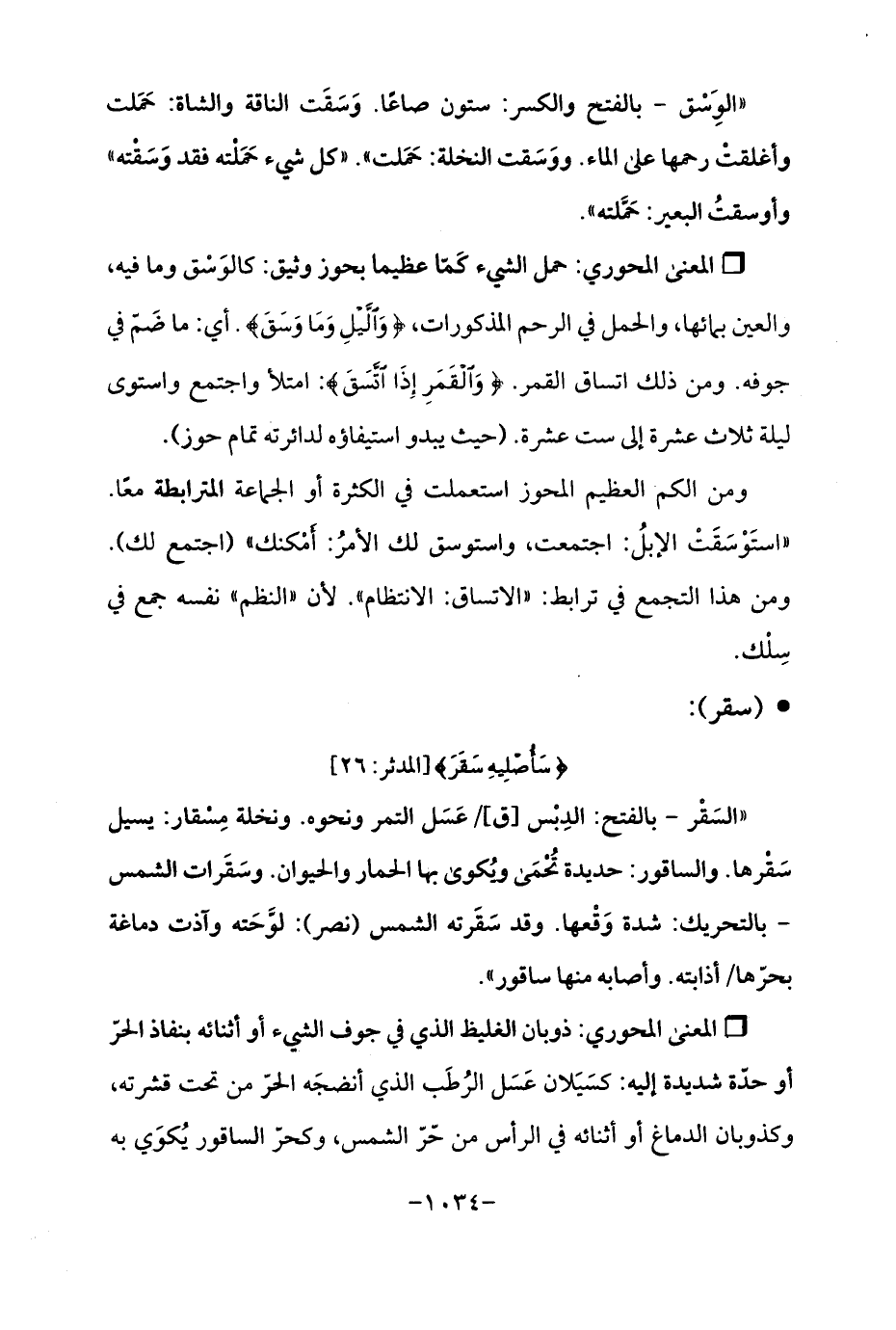 Qحمل الشيء كَمّا عظيما بحوز وثيق: كالوَسْق وما فيه، والعين بمائها، والحمل في الرحم المذكورات، {وَاللَّيْلِ وَمَا وَسَقَ}. أي: ما ضَمّ في جوفه. ومن ذلك اتساق القمر. {وَالْقَمَرِ إِذَا اتَّسَقَ}: امتلأ واجتمع واستوى ليلة ثلاث عشرة إلى ست عشرة. (حيث يبدو استيفاؤه لدائرته تمام حوز).