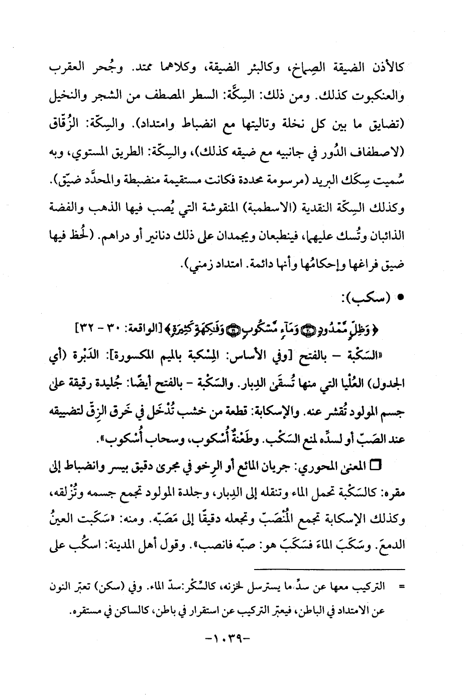 Qجريان المائع أو الرِخو في مجرى دقيق بيسر وانضباط إلى مقره: كالسَكْبة تحمل الماء وتنقله إلى الدِبار، وجلدة المولود تجمع جسمه وتُزْلقه، وكذلك الإسكابة تجمع المُنْصَبّ وتجعله دقيقًا إلى مَصَبّه. ومنه: "سَكَبت العينُ الدمعَ. وسَكَبَ الماءَ فسَكَبَ هو: صبّه فانصب ". وقول أهل المدينة: اسكُب على