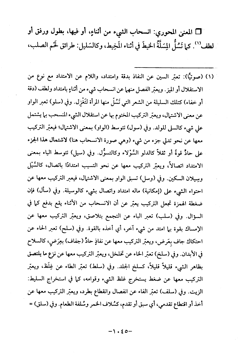 (¬1) (صوتيًّا): تعبّر السين عن النفاذ بدقة وامتداد، واللام عن الامتداد مع نوع من الاستقلال أو الميز. ويعبّر الفصل منهما عن انسحاب شيء من أثناءٍ بامتداد ولطف (دقة أو خفاء) كتلك السليلة من الشعر التي تَسُلّ منها المرأة لتَغْزِل. وفي (سلو) تعبر الواو عن معنى الاشتمال، ويعبّر التركيب المختوم بها عن استقلال الشيء المنسحب بما يشتمل علي شيء كالسلي للولد. وفي (سول) تتوسط (الواو) بمعنى الاشتمال؛ فيعبّر التركيب معها عن نحو تدلي جزء من شيء (وهي صورة الانسحاب هنا) لاشتمال هذا الجزء على حادٍّ قوةً أو ثقلًا كالدلو السَّوْلاء وكالتسوُّل. وفي (سيل) تتوسط الياء بمعنى الامتداد اتصالًا، ويعبّر التركيب معها عن نحو التسيب امتدادًا باتصال، كالسَّيْل وسِيلان السكين. وفي (وسل) تسبق الواو بمعنى الاشتمال، فيعبر التركيب معها عن احتواء الشيء على (إمكانية) ما له امتداد واتصال بشيء كالوسيلة. وفي (سأل) فإن ضغطة الهمزة تجعل التركيب يعبّر عن أن الانسحاب من الأثناء يقع بدفع كما في السؤال. وفي (سلب) تعبر الباء عن التجمع بتلاصق، ويعبّر التركيب معها عن الإمساك بقوة بما امتد من شيء آخر، أي أخذه بالقوة. وفي (سلح) تعبر الحاء عن احتكاك جاف بِعَرض، ويعبّر التركيب معها عن نفاذٍ حادٍّ (جفاف) بعِرَضٍ، كالسلاح في الأبدان. وفي (سلخ) تعبّر الخاء عن تخلخل، ويعبّر التركيب معها عن نزع ما يلتصق بظاهر الشيء قليلًا قليلًا، كسلخ الجلد. وفي (سلط) تعبّر الطاء عن غِلَظ، ويعبّر التركيب معها عن ضغط يستخرج غلظ الشيء وقوامه، كما في استخراج السليط: الزيت. وفي (سلف) تعبّر الفاء عن انفصال وانقطاع بطرد، ويعبّر التركيب معها عن أخذ أو اقتطاع تقدمي، أي سبق أو تقدم، كسُلاف الخمر وسُلفة الطعام. وفي (سلق) =