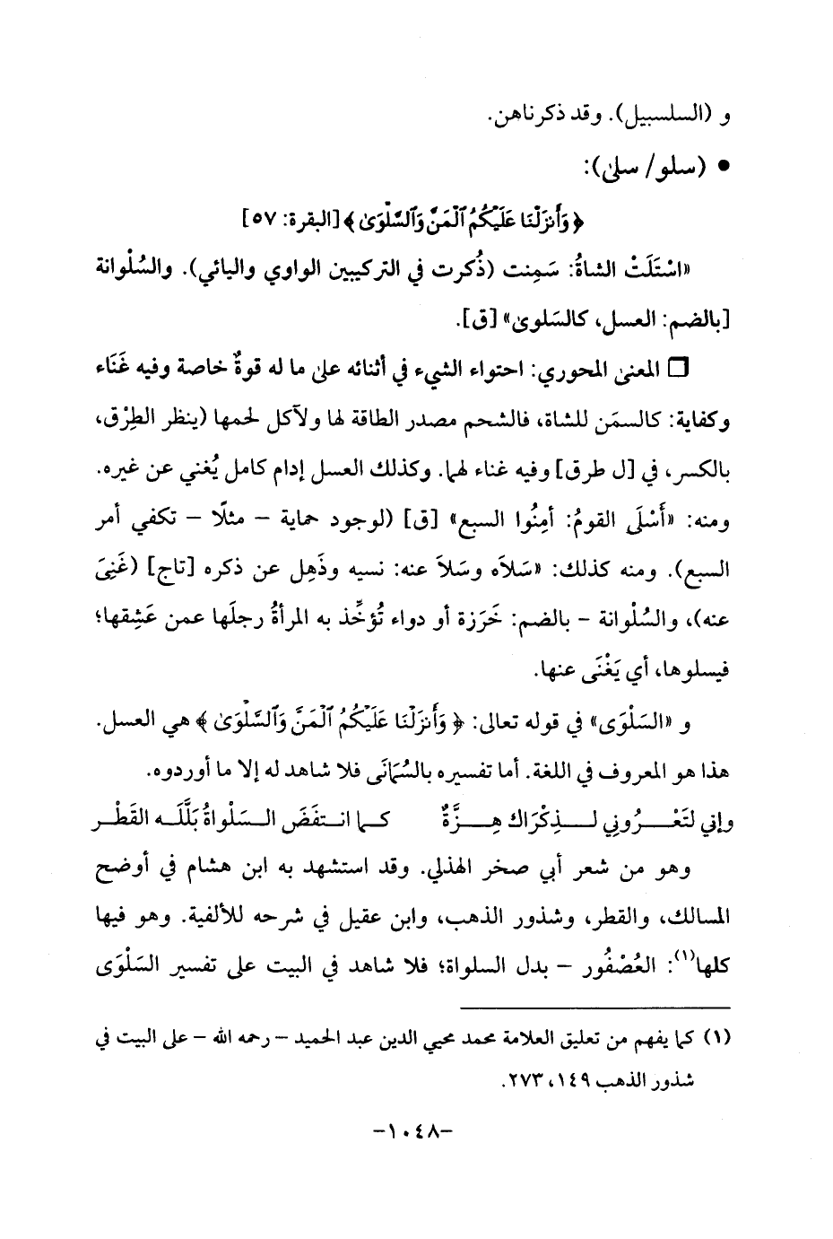 و"السَلْوَى "في قوله تعالى: {وَأَنْزَلْنَا عَلَيْكُمُ الْمَنَّ وَالسَّلْوَى} هى العسل. هذا هو المعروف في اللغة. أما تفسيره بالسُمَانَي فلا شاهد له إلا ما أوردوه.