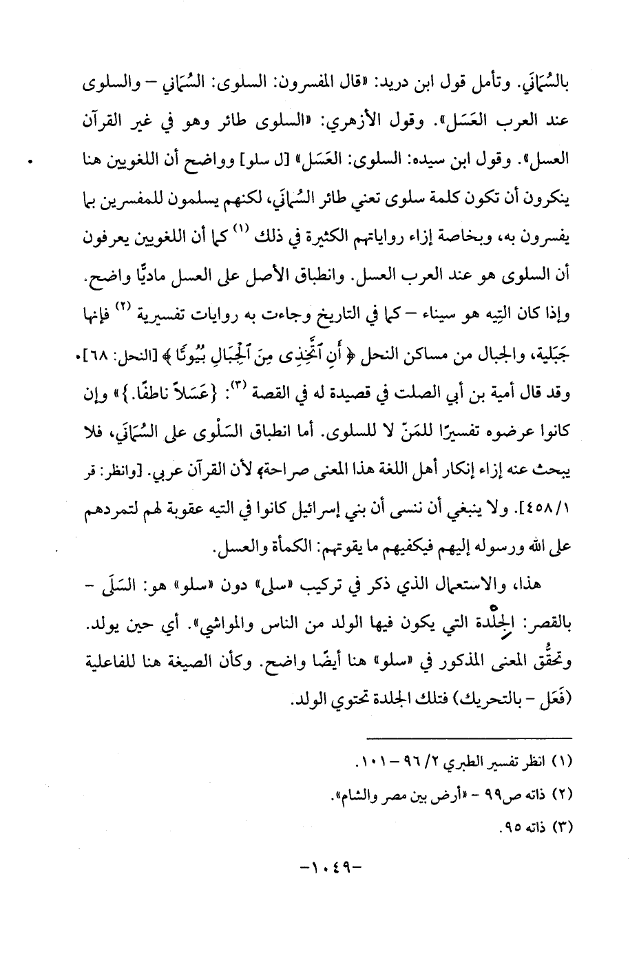 بالسُمَانَي. وتأمل قول ابن دريد: "قال المفسرون: السلوى: السُمَاني - والسلوى عند العرب العَسَل ". وقول الأزهري: "السلوى طائر وهو في غير القرآن العسل ". وقول ابن سيده: السلوى: العَسَل " [ل سلو] وواضح أن اللغويين هنا ينكرون أن تكون كلمة سلوى تعني طائر السُمانَي، لكنهم يسلمون للمفسرين بما يفسرون به، وبخاصة إزاء رواياتهم الكثيرة في ذلك (¬1) كما أن اللغويين يعرفون أن السلوى هو عند العرب العسل. وانطباق الأصل على العسل ماديًّا واضح. وإذا كان التِيه هو سيناء - كما في التاريخ وجاءت به روايات تفسيرية (¬2) فإنها جَبَلية، والجبال من مساكن النحل {أَنِ اتَّخِذِي مِنَ الْجِبَالِ بُيُوتًا} [النحل: 68]. وقد قال أمية بن أبي الصلت في قصيدة له في القصة (¬3): (عَسَلًا ناطفًا.) "وإن كانوا عرضوه تفسيرًا للمَنّ لا للسلوى. أما انطباق السَلْوى على السُمَانَي، فلا يبحث عنه إزاء إنكار أهل اللغة هذا المعنى صراحة، لأن القرآن عربي. [وانظر: قر 1/ 458]. ولا ينبغي أن ننسى أن بني إسرائيل كانوا في التيه عقوبة لهم لتمردهم على الله ورسوله إليهم فيكفيهم ما يقوتهم: الكمأة والعسل.