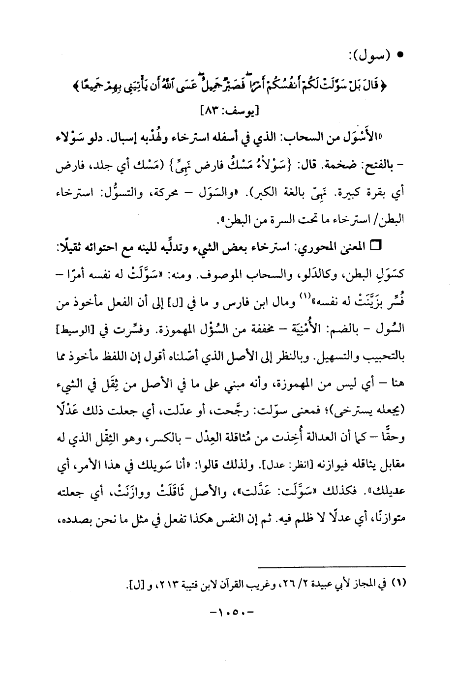 Qاسترخاء بعض الشيء وتدلِّيه للينه مع احتوائه ثقيلًا: كسَوَلِ البطن، وكالدَلو، والسحاب الموصوف. ومنه: "سَوَّلَتْ له نفسه أمرًا - فُسِّر بزَيَّنَتْ له نفسه " (¬1) ومال ابن فارس وما في [ل] إلى أن الفعل مأخوذ من السُول - بالضم: الأُمْنِيَة - مخففة من السُؤْل المهموزة. وفسِّرت في [الوسيط] بالتحبيب والتسهيل. وبالنظر إلى الأصل الذي أصّلناه أقول إن اللفظ مأخوذ مما هنا - أي ليس من المهموزة، وأنه مبني على ما في الأصل من ثِقَل في الشيء (يجعله يسترخي)؛ فمعنى سوّلت: رجَّحت، أو عدّلت، أي جعلت ذلك عَدْلًا وحقًّا - كما أن العدالة أُخِذت من مُثاقلة العِدْل - بالكسر، وهو الثِقْل الذي له مقابل يثاقله فيوازنه [انظر: عدل]. ولذلك قالوا: "أنا سَويلك في هذا الأمر، أي عديلك ". فكذلك "سَوَّلَت: عَدَّلت "، والأصل ثَاقَلَتْ ووازَنَتْ، أي جعلته متوازنًا، أي عدلًا لا ظلم فيه. ثم إن النفس هكذا تفعل في مثل ما نحن بصدده،