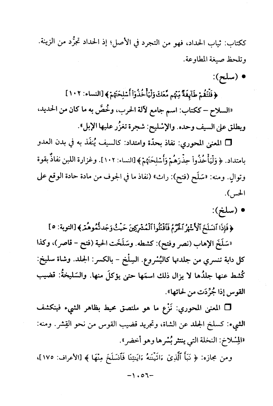 Qنفاذ بحدّة وامتداد: كالسيف يُنفَذ به في بدن العدو بامتداد. {وَلْيَأْخُذُوا حِذْرَهُمْ وَأَسْلِحَتَهُمْ} [النساء: 102]. وغزارة اللبن نفاذٌ بقوة وتوالٍ. ومنه: "سَلَح (فتح): راث " (نفاذ ما في الجوف من مادة حادة الوقع على الحس).