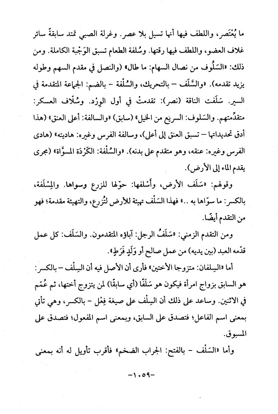 ما يُعْتَصر، واللطف فيها أنها تسيل بلا عصر. وغرلة الصبي تمتد سابقةً سائر غلاف العضو، واللطف فيها رقتها. وسُلفة الطعام تسبق الوَجْبة الكاملة. ومن ذلك: "السَلُوف من نصال السهام: ما طال ". (والنصل في مقدم السهم وطوله يزيد تقدمه). "والسَّلَف - بالتحريك، والسُلْفة - بالضم: الجماعة المتقدمة في السير. سَلَفت الناقة (نصر): تقدمتْ في أول الوِرْد. وسُلّاف العسكر: متقدَّمتهم. والسَلوف: السريع من الخيل " (سابق) "والسالفة: أعلى العنق " (هذا أدق تحديداتها - تسبق العنق إلى أعلى)، وسالفة الفرس وغيره: هاديته " (هادى الفرس وغيره: عنقه، وهو متقدم على بدنه). "والسُلْفة: الكَرْدَة المسوَّاة " (مجرى يقدم الماء إلى الأرض).