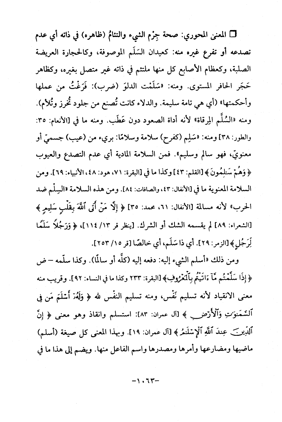 Qصحة جِرْم الشيء والتئامُ (ظاهره) في ذاته أي عدم تصدعه أو تفرع غيره منه: كعيدان السَلَم الموصوفة، وكالحجارة العريضة الصلبة، وكعظام الأصابع كل منها ملتئم في ذاته غير متصل بغيره، وكظاهر حَجَر الحافر المستوى. ومنه: "سَلَمْت الدلوَ (ضرب): فَرَغْتُ من عملها وأحكمتها " (أي هي تامة سليمة. والدلاء كانت تُصنع من جلود تُخرز وتُلأم). ومنه "السُلَّم المِرقاة "لأنه أداة الصعود دون عَطَب. ومنه ما في [الأنعام: 35: والطور: 38] ومنه: "سَلِم (كفرح) سلامة وسلامًا: بريء من (عيب) جسميّ أو معنويّ، فهو سالم وسليم ". فمن السلامة المادية أي عدم التصدع والعيوب {وَهُمْ سَالِمُونَ} [القلم: 43] وكذا ما في [البقرة: 71، هود: 48، الأنبياء: 69]. ومن السلامة المعنوية ما في [الأنفال: 43، والصافات: 84]. ومن هذه السلامة "السِلْم ضد الحرب "لأنه مسالمة [الأنفال: 61، محمد: 35] {إِلَّا مَنْ أَتَى اللَّهَ بِقَلْبٍ سَلِيمٍ} [الشعراء: 89] لم يقسمه الشك أو الشرك. [ينظر قر 13/ 114]، {وَرَجُلًا سَلَمًا لِرَجُلٍ} [الزمر: 29]. أي ذا سَلَم، أي خالصًا [قر 15/ 253].
