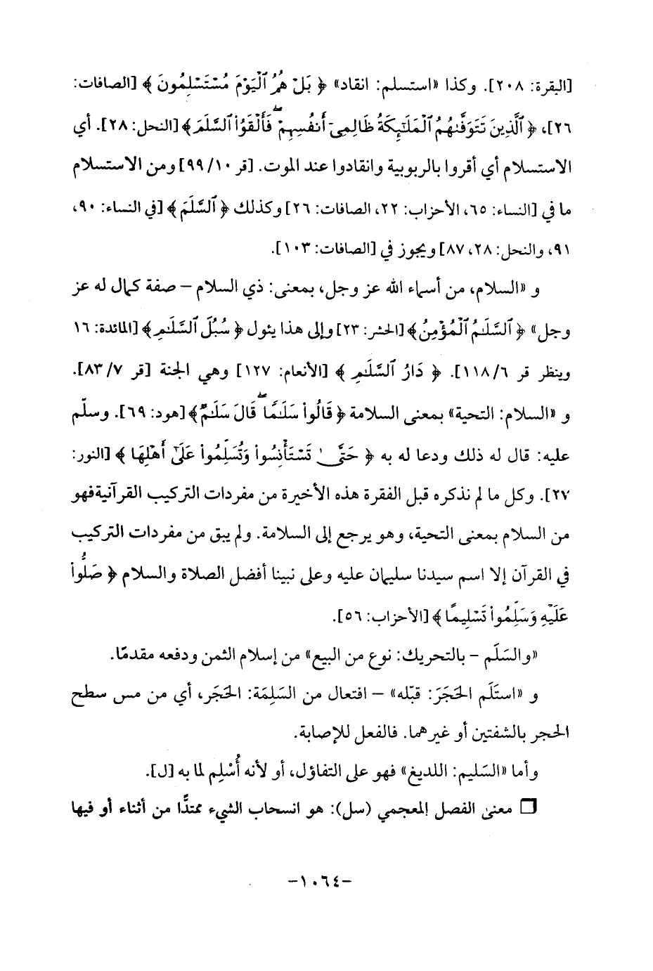[البقرة: 208]. وكذا "استسلم: انقاد " {بَلْ هُمُ الْيَوْمَ مُسْتَسْلِمُونَ} [الصافات: 26]، {الَّذِينَ تَتَوَفَّاهُمُ الْمَلَائِكَةُ ظَالِمِي أَنْفُسِهِمْ فَأَلْقَوُا السَّلَمَ} [النحل: 28]. أي الاستسلام أي أقروا بالربوبية وانقادوا عند الموت. [قر 10/ 99] ومن الاستسلام ما في [النساء: 65، الأحزاب: 22، الصافات: 26] وكذلك {السَّلَمَ} [في النساء: 90، 91، والنحل: 28، 87] ويجوز في [الصافات: 103].