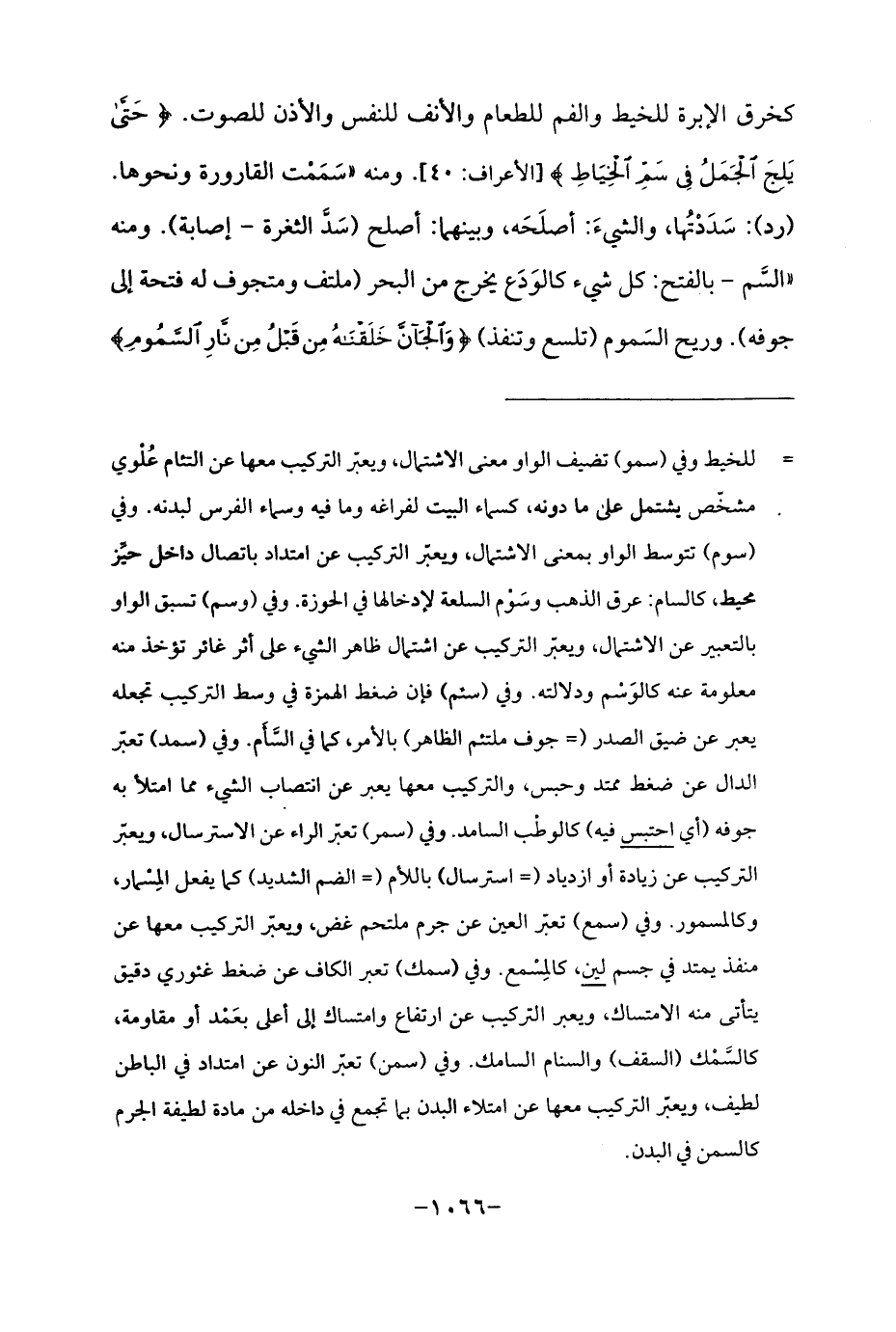 كخرق الإبرة للخيط والفم للطعام والأنف للنفس والأذن للصوت. {حَتَّى يَلِجَ الْجَمَلُ فِي سَمِّ الْخِيَاطِ} [الأعراف: 40]. ومنه "سَمَمْت القارورة ونحوها. (رد): سَدَدْتُها، والشيءَ: أصلَحَه، وبينهما: أصلح (سَدَّ الثغرة - إصابة). ومنه (السَّم - بالفتح: كل شيء كالوَدَع يخرج من البحر (ملتف ومتجوف له فتحة إلى جوفه). وريح السَموم (تلسع وتنفذ) {وَالْجَانَّ خَلَقْنَاهُ مِنْ قَبْلُ مِنْ نَارِ السَّمُومِ}