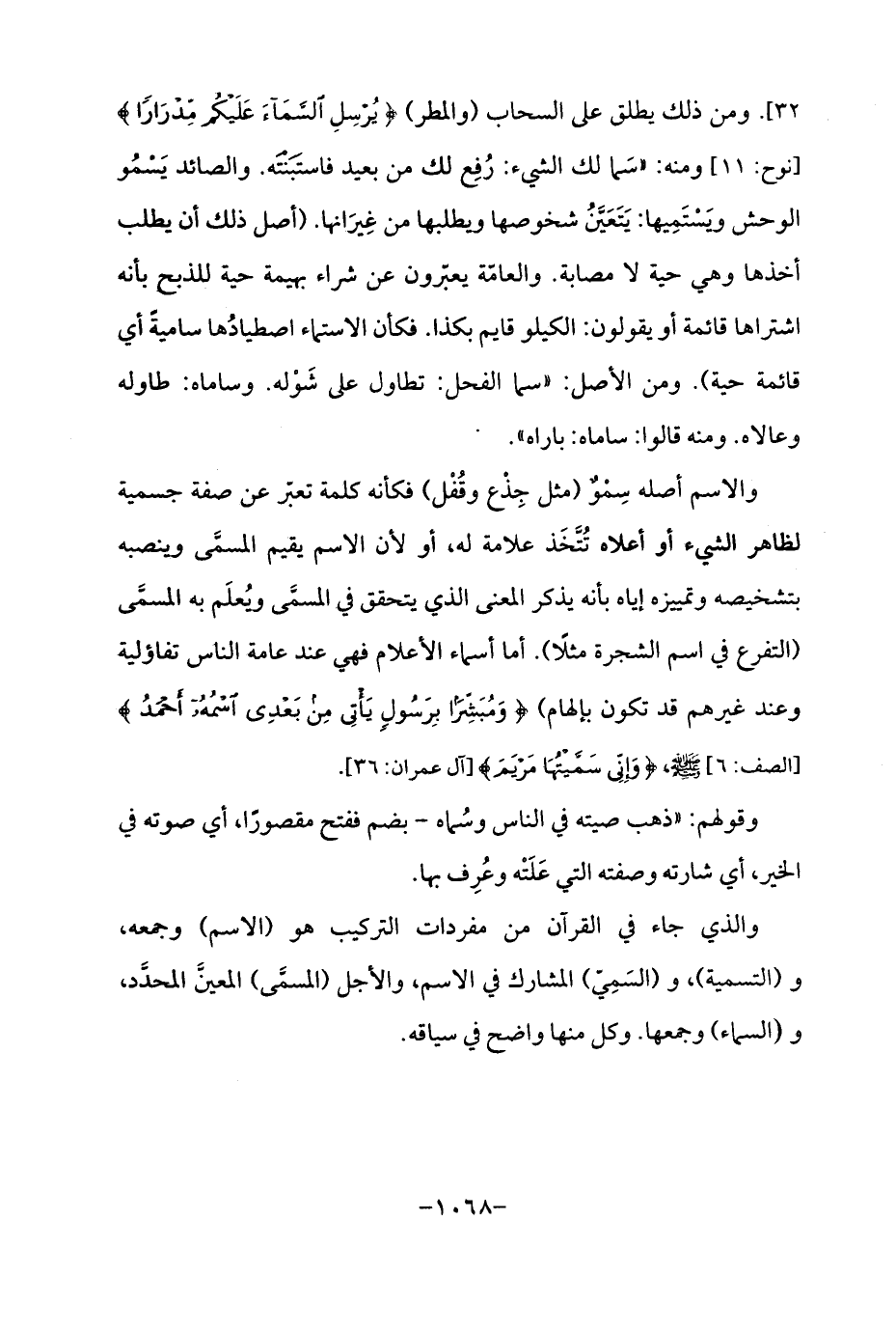 والذي جاء في القرآن من مفردات التركيب هو (الاسم) وجمعه، و (التسمية)، و (السَمِيّ) المشارك في الاسم، والأجل (المسمَّى) المعيَّن المحدَّد، و (السماء) وجمعها. وكل منها واضح في سياقه.