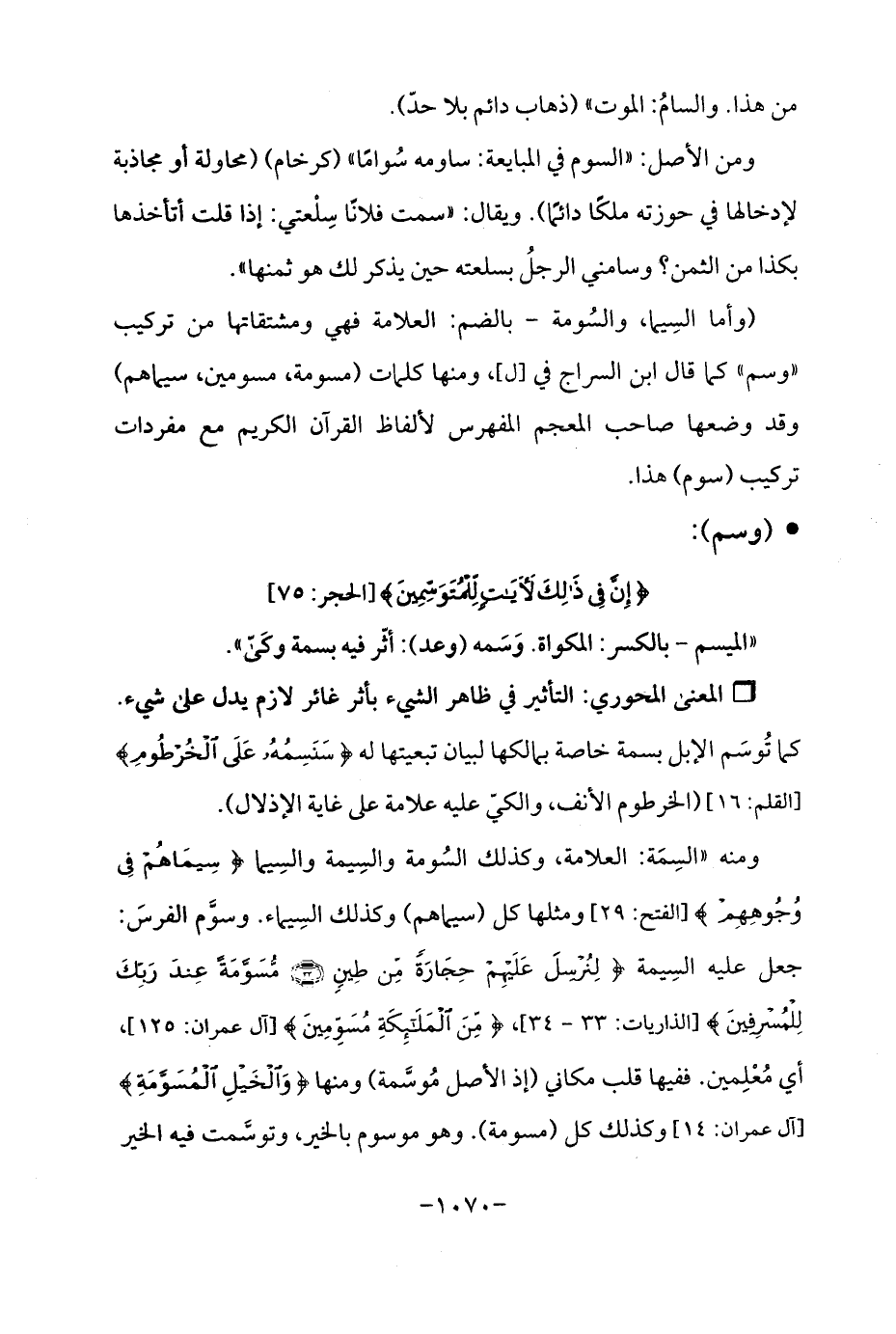 (وأما السِيما، والسُومة - بالضم؛ العلامة فهي ومشتقاتها من تركيب "وسم "كما قال ابن السراج في [ل]، ومنها كلمات (مسومة، مسومين، سيماهم) وقد وضعها صاحب المعجم المفهرس لألفاظ القرآن الكريم مع مفردات تركيب (سوم) هذا.