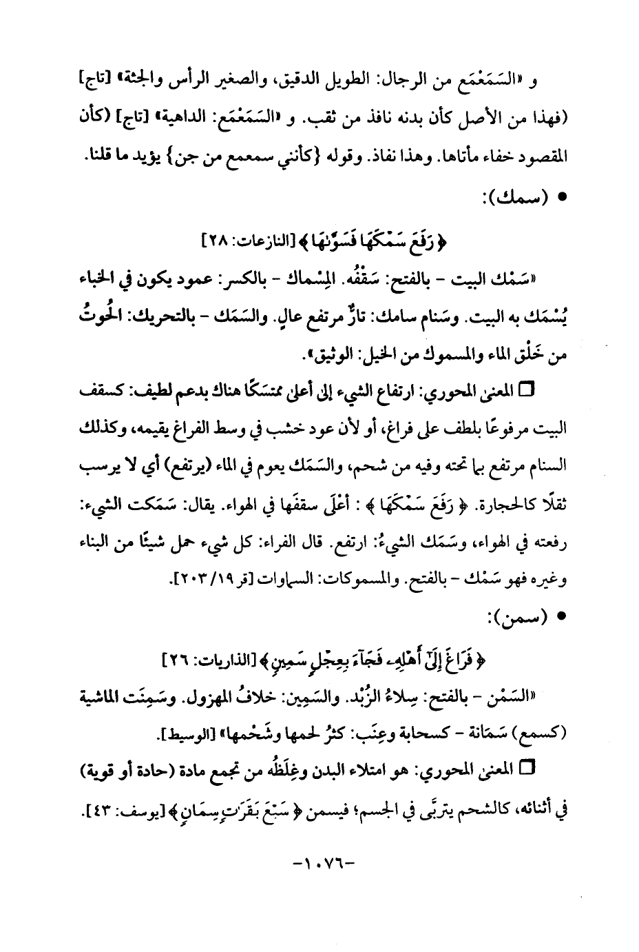 Qارتفاع الشيء إلى أعلى ممتسَكًا هناك بدعم لطيف: كسقف البيت مرفوعًا بلطف على فراغ، أو لأن عود خشب في وسط الفراغ يقيمه، وكذلك السنام مرتفع بما تحته وفيه من شحم، والسَمَك يعوم في الماء (يرتفع) أي لا يرسب ثقلًا كالحجارة. {رَفَعَ سَمْكَهَا}: أعْلَى سقفَها في الهواء. يقال: سَمَكت الشيء: رفعته في الهواء، وسَمَك الشيءُ: ارتفع. قال الفراء: كل شيء حمل شيئًا من البناء وغيره فهو سَمْك - بالفتح. والمسموكات: السماوات [قر 19/ 203].
