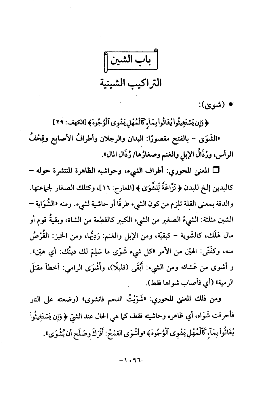Qأطراف الشيء، وحواشيه الظاهرة المنتشرة حوله - كاليدين إلخ للبدن {نَزَّاعَةً لِلشَّوَى} [المعارج: 16]، وكتلك الصغار لجماعتها. والدقة بمعنى القلة تلزم من كون الشيء طرفًا أو حاشية لشيء. ومنه "الشُوَاية - الشين مثلثة: الشيءُ الصغير من الشيء الكبير كالقطعة من الشاة، وبقيةُ قوم أو مال هَلَك، كالشَوية - كبقيّة، ومن الإبل والغنم: رَدِيُّها، ومن الخبز: القُرْصُ منه، وكفَتًى: الهيّن من الأمر "كل شيء شَوَى ما سَلِمَ لك دينُك: أي هيّن ". وأشوى من عَشائه ومن الشيء: أَبْقَى (قليلًا)، وأَشْوَى الرامي: أخطأ مقتلَ الرمية " (أي فأصاب شواها فقط).