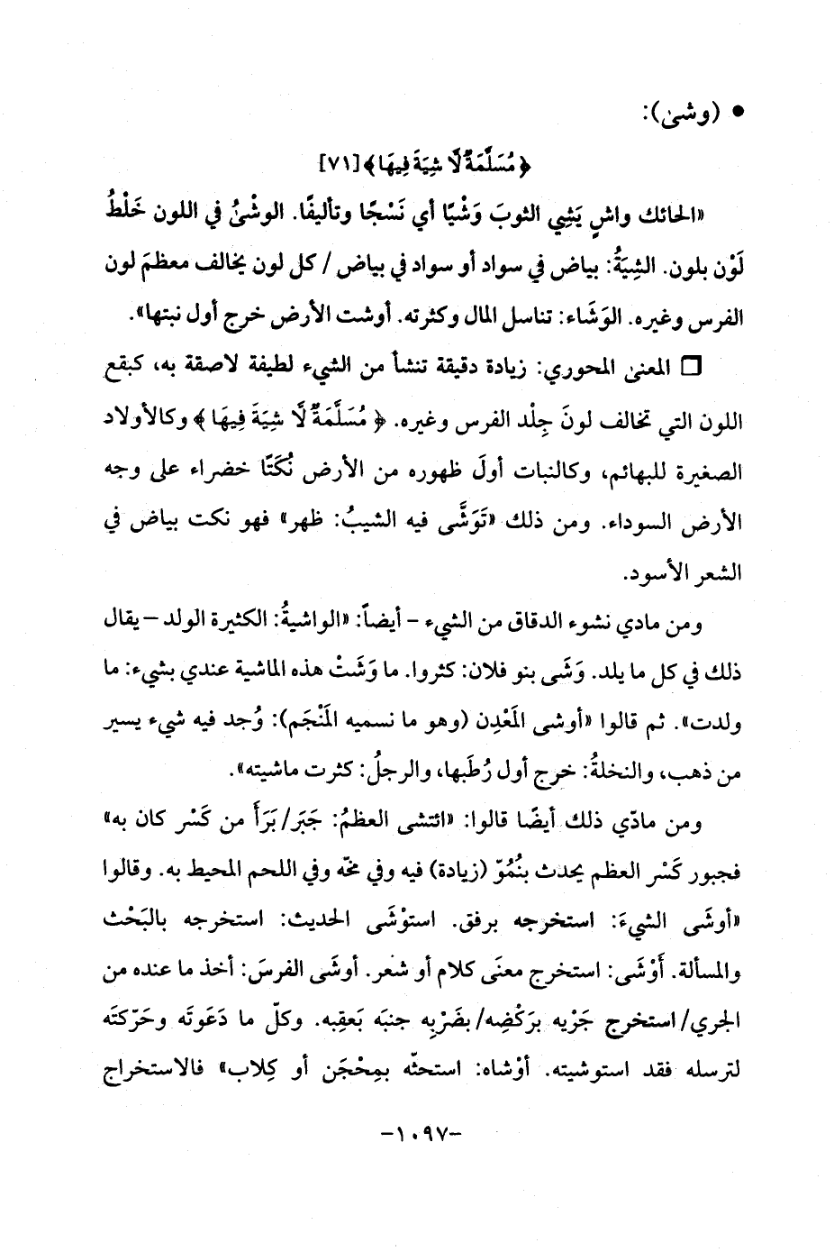 "الحائك واشٍ يَشِي الثوبَ وَشْيًا أي نَسْجًا وتأليفًا. الوشْىُ في اللون خَلْطُ لَوْن بلون. الشِيَةُ: بياض في سواد أو سواد في بياض/ كل لون يخالف معظمَ لون الفرس وغيره. الوَشَاء: تناسل المال وكثرته. أوشت الأرض خرج أول نبتها ".