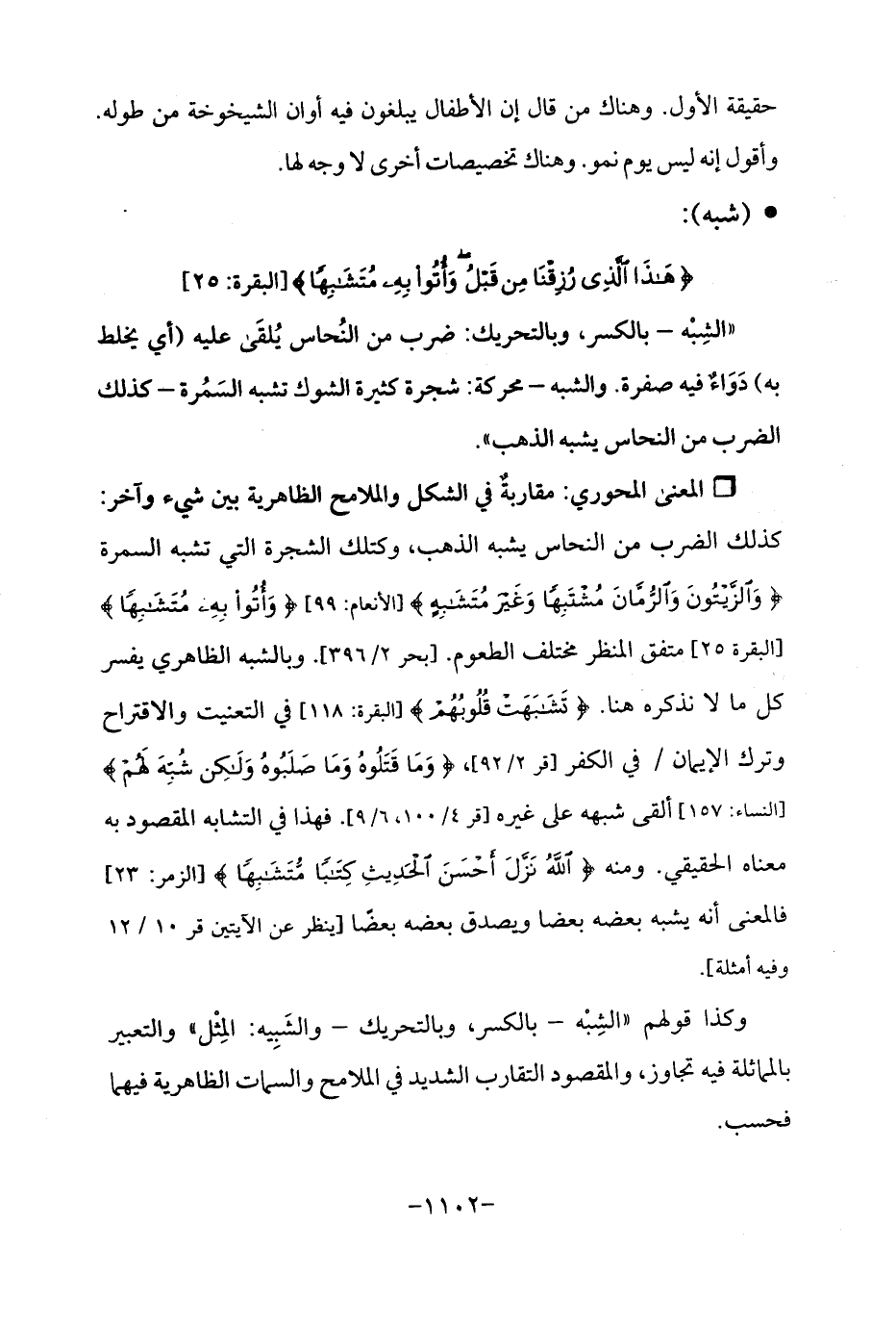 Qمقاربةٌ في الشكل والملامح الظاهرية بين شيء وآخر: كذلك الضرب من النحاس يشبه الذهب، وكتلك الشجرة التي تشبه السمرة {وَالزَّيْتُونَ وَالرُّمَّانَ مُشْتَبِهًا وَغَيْرَ مُتَشَابِهٍ} [الأنعام: 99] {وَأُتُوا بِهِ مُتَشَابِهًا} [البقرة 25] متفق المنظر مختلف الطعوم. [بحر 2/ 396]. وبالشبه الظاهري يفسر كل ما لا نذكره هنا. {تَشَابَهَتْ قُلُوبُهُمْ} [البقرة: 118] في التعنيت والاقتراح وترك الإيمان في الكفر [قر 2/ 92]، {وَمَا قَتَلُوهُ وَمَا صَلَبُوهُ وَلَكِنْ شُبِّهَ لَهُمْ} [النساء: 157] ألقى شبهه على غيره [قر 4/ 100، 6/ 9]. فهذا في التشابه المقصود به معناه الحقيقي. ومنه {اللَّهُ نَزَّلَ أَحْسَنَ الْحَدِيثِ كِتَابًا مُتَشَابِهًا} [الزمر: 23] فالمعنى أنه يشبه بعضه بعضا ويصدق بعضه بعضًا [ينظر عن الآيتين قر 10/ 12 وفيه أمثلة].