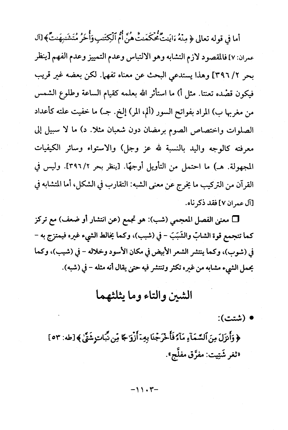أما في قوله تعالى {مِنْهُ آيَاتٌ مُحْكَمَاتٌ هُنَّ أُمُّ الْكِتَابِ وَأُخَرُ مُتَشَابِهَاتٌ} [آل عمران: 7] فالمقصود لازم التشابه وهو الالتباس وعدم التمييز وعدم الفهم [ينظر بحر 2/ 396] وهذا يستدعي البحث عن معناه تفهما. لكن بعضه غير قريب فيكون قضده تعنتا. مثل أ) ما استأثر اللَّه بعلمه كقيام الساعة وطلوع الشمس من مغربها ب) المراد بفواتح السور (ألم، المر) إلخ. جـ) ما خفيت علته كأعداد الصلوات واختصاص الصوم برمضان دون شعبان مثلا. د) ما لا سبيل إلى معرفته كالوجه واليد بالنسبة للَّه عز وجل) والاستواء وسائر الكيفيات المجهولة. هـ) ما احتمل من التأويل أوجهًا. [ينظر بحر 2/ 396]. وليس في القرآن من التركيب ما يخرج عن معنى الشبه: التقارب في الشكل، أما المتشابه في [آل عمران 7] فقد ذكرناه.