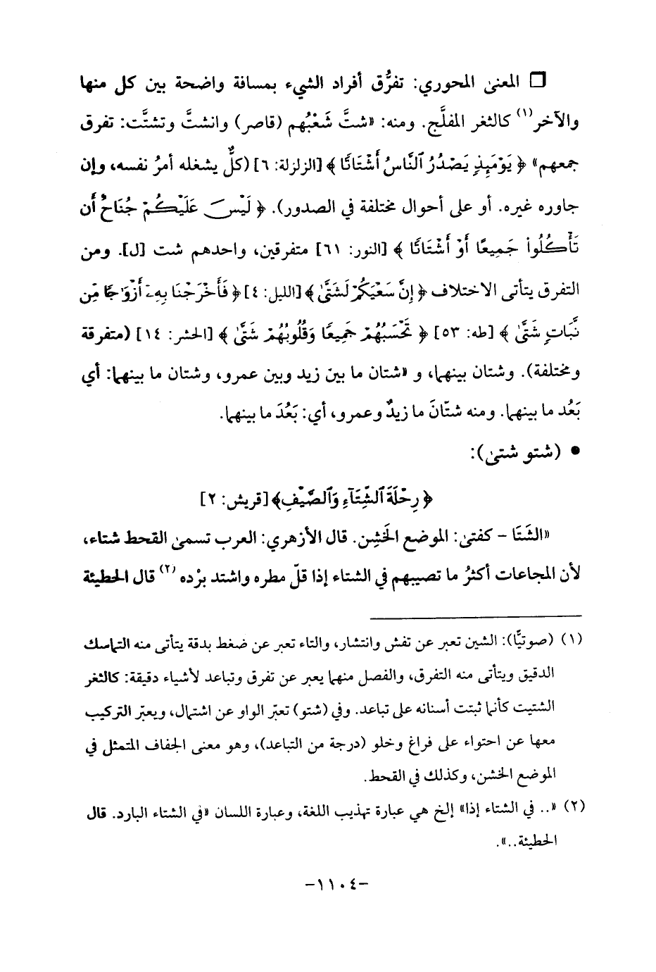 Qتفرق أفراد الشيء بمسافة واضحة بين كل منها والآخر (¬1) كالثغر المفلَّج. ومنه: "شتَّ شَعْبُهم (قاصر) وانشتَّ وتشتَّت: تفرق جمعهم " {يَوْمَئِذٍ يَصْدُرُ النَّاسُ أَشْتَاتًا} [الزلزلة: 6] (كلٌّ يشغله أمرُ نفسه، وإن جاوره غيره. أو على أحوال مختلفة في الصدور). {لَيْسَ عَلَيْكُمْ جُنَاحٌ أَنْ تَأْكُلُوا جَمِيعًا أَوْ أَشْتَاتًا} [النور: 61] متفرقين، واحدهم شت [ل]. ومن التفرق يتأتى الاختلاف {إِنَّ سَعْيَكُمْ لَشَتَّى} [الليل: 4] {فَأَخْرَجْنَا بِهِ أَزْوَاجًا مِنْ نَبَاتٍ شَتَّى} [طه: 53] {تَحْسَبُهُمْ جَمِيعًا وَقُلُوبُهُمْ شَتَّى} [الحشر: 14] (متفرقة ومختلفة). وشتان بينهما، و "شتان ما بين زيد وبين عمرو، وشتان ما بينهما: أي بَعُد ما بينهما. ومنه شتانَ ما زيدٌ وعمرو، أي: بَعُدَ ما بينهما.