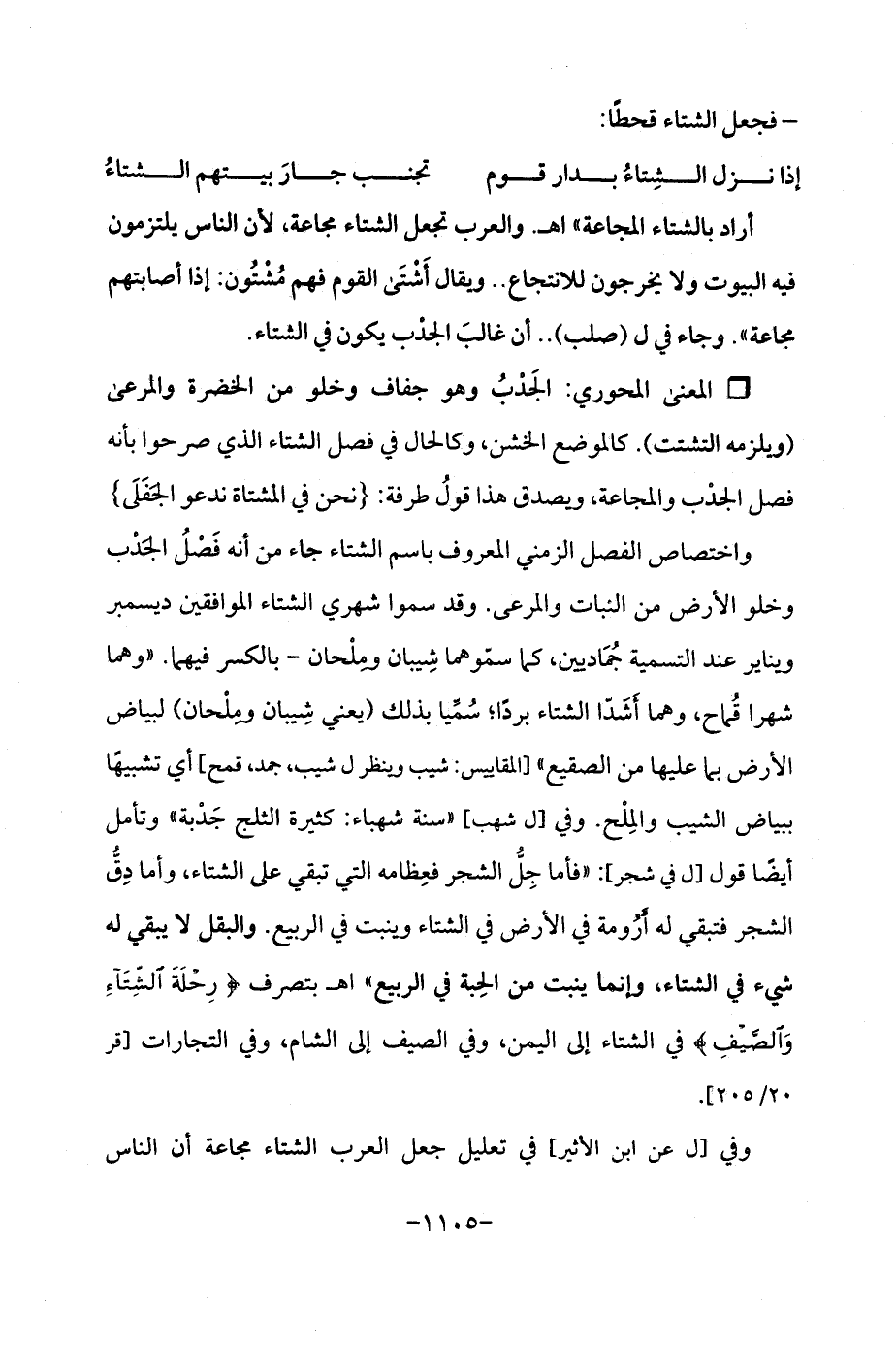 واختصاص الفصل الزمني المعروف باسم الشتاء جاء من أنه فَصْلُ الجَدْب وخلو الأرض من النبات والمرعى. وقد سموا شهري الشتاء الموافقين ديسمبر ويناير عند التسمية جُمَاديين، كما سمّوهما شِيبان ومِلْحان -بالكسر فيهما. "وهما شهرا قُماح، وهما أَشَدّا الشتاء بردًا؛ سُمِّيا بذلك (يعني شِيبان ومِلْحان) لبياض الأرض بما عليها من الصقيع " [المقاييس: شيب وينظر ل شيب، جمد، قمح] أي تشبيهًا ببياض الشيب والمِلْح. وفي [ل شهب] "سنة شهباء: كثيرة الثلج جَدْبة "وتأمل أيضًا قول [ل في شجر]: "فأما جِلُّ الشجر فعِظامه التي تبقي على الشتاء، وأما دِقُّ الشجر فتبقي له أَرُومة في الأرض في الشتاء وينبت في الربيع. والبقل لا يبقي له شيء في الشتاء، وإنما ينبت من الحِبة في الربيع "اهـ بتصرف {رِحْلَةَ الشِّتَاءِ وَالصَّيْفِ} في الشتاء إلى اليمن، وفي الصيف إلى الشام، وفي التجارات [قر 20/ 205].