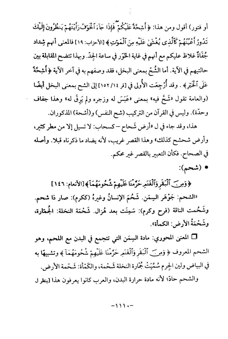 أو فتور) أقول ومن هذا: {أَشِحَّةً عَلَيْكُمْ فَإِذَا جَاءَ الْخَوْفُ رَأَيْتَهُمْ يَنْظُرُونَ إِلَيْكَ تَدُورُ أَعْيُنُهُمْ كَالَّذِي يُغْشَى عَلَيْهِ مِنَ الْمَوْتِ} [الأحزاب: 19] فالمعنى أنهم شِداد جُفَاةٌ غلاظ عليكم مع أنهم في غاية الخَوَر في ساعة الجِدّ. وبهذا تتضح المقابلة بين حالتيهم في الآية. أما الشُحّ بمعنى البخل، فقد وصفهم به في آخر الآية {أَشِحَّةً عَلَى الْخَيْرِ}. وقد أُرْجِعَت الأُولى في [قر 14/ 152] إلى الشح بمعنى البخل أيضًا (والعامة تقول "شَحَّ فيه "بمعنى "عَبَسَ له وزجره ولم يَرِقّ له "وهذا جفاف وحدّة). وليس في القرآن من التركيب (شح النفس) و (أشحة) المذكوران.