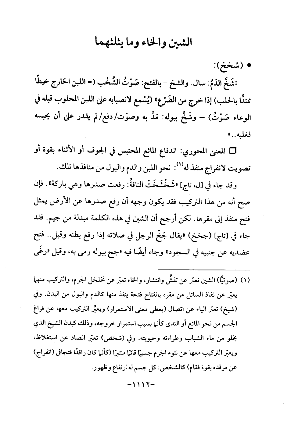 (¬1) (صوتيًّا) الشين تعبّر عن تفشٍّ وانتشار، والخاء تعبّر عن تخلخل الجرم، والتركيب منهما يعبّر عن نفاذ السائل من مقره بانفتاح فتحة ينفذ منها كالدم والبول من البدن. وفي (شيخ) تعبّر الياء عن اتصال (يعطي معنى الاستمرار) ويعبِّر التركيب معها عن فراغ الجسم من نحو المائع أو الندى كأنما بسبب استمرار خروجه، وذلك كبدن الشيخ الذي يخلو من ماء الشباب وطراءته وحيويته. وفي (شخص) تعبّر الصاد عن استغلاظ، ويعبّر التركيب معها عن نتوء الجرم جسيمًا قائمًا منتبرًا (كأنما كان راقدًا فتجافى (انفراج) عن مرقده بقوة فقام) كالشخص: كل جسم له ارتفاع وظهور.