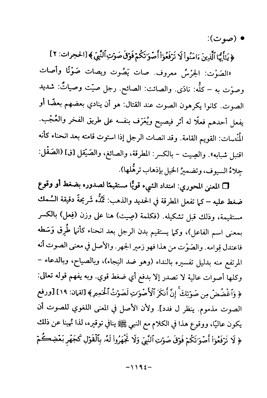 Qامتداد الشيء قويًّا مستقيمًا لصدوره بضغط أو وقوع ضفط عليه -كما تفعل المطرقة في الحديد والذهب: مَمُدُّه شَريحةَ دقيقة السُمك مستقيمة، وذلك قبل تشكيله. (فكلمة (صِيت) هنا على وزن (فِعل) بالكسر بمعنى اسم الفاعل)، وكما يستقيم بدن الرجل بعد انحناء كأنما طُرِق وَسَطه فاعتدل قِوامه. والصَوْت من هذا فهو زمير الجهر. والأصل في معنى الصوت أنه المرتفع منه بدليل تفسيره بالنداء (وهو ضد النِجاء)، وبالصياح، وبالدعاء -وكلها أصوات عالية لا تصدر إلا بدفع أي ضغط قوي- وبه يفهم قوله تعالى: {وَاغْضُضْ مِنْ صَوْتِكَ إِنَّ أَنْكَرَ الْأَصْوَاتِ لَصَوْتُ الْحَمِيرِ} [لقمان: 19] [ورفع الصوت مذموم. ينظر ل فدد]. ولأن الأصل في المعنى اللغوي للصوت أن يكون عاليًا، ووقوع هذا في الكلام مع النبي -صلى اللَّه عليه وسلم- ينافي توقيره، لذا نُهينا عن ذلك {لَا تَرْفَعُوا أَصْوَاتَكُمْ فَوْقَ صَوْتِ النَّبِيِّ وَلَا تَجْهَرُوا لَهُ بِالْقَوْلِ كَجَهْرِ بَعْضِكُمْ