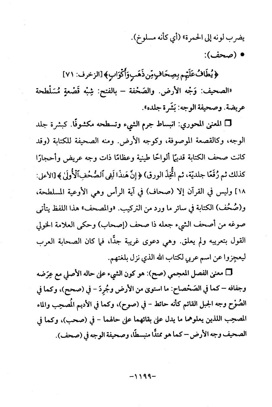 Qانبساط جرم الشيء وتسطحه مكشوفًا. كبشرة جلد الوجه، وكالقصعة الموصوفة، وكوجه الأرض. ومنه الصحيفة للكتابة (وقد كانت صحف الكتابة قديمًا ألواحًا طينية وعظامًا ذات وجه عريض وأحجارًا كذلك ثم رُقَعًا جلديّة، ثم اتُّخِذَ الورق) {إِنَّ هَذَا لَفِي الصُّحُفِ الْأُولَى} [الأعلى: 18] وليس في القرآن إلا (صحاف) في آية الرأس وهي الأوعية المسلطحة، و (صُحُف) الكتابة في سائر ما ورد من التركيب. (والمصحف، هذا اللفظ يتأتى صوغه من أصحف الشيء جعله ذا صحف (إصحاب) وحكى العلامة الخولي القول بتعريبه ولم يعلق. وهي دعوى غريبة جدًّا، فما كان الصحابة العرب ليعجِزوا عن اسم عربي لكتاب اللَّه الذي نزل بلغتهم.