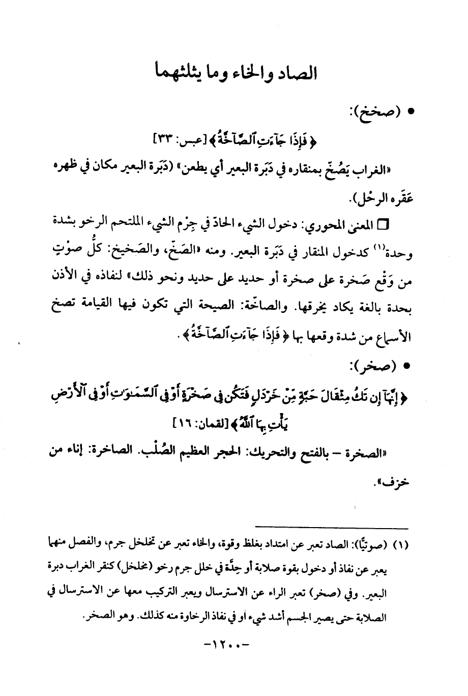 (¬1) (صوتيًّا): الصاد تعبر عن امتداد بغلظ وقوة، والخاء تعبر عن تخلخل جرم، والفصل منهما يعبر عن نفاذ أو دخول بقوة صلابة أو حِدَّة في خلل جرم رخو (مخلخل) كنقر الغراب دبرة البعير. وفي (صخر) تعبر الراء عن الاسترسال ويعبر التركيب معها عن الاسترسال في الصلابة حتى يصير الجسم أشد شيء أو في نفاذ الرخاوة منه كذلك. وهو الصخر.