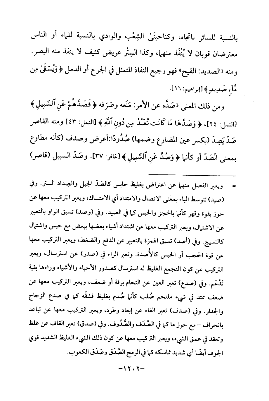ومن ذلك المعنى "صَدَّه عن الأمر: مَنَعه وصَرَفه {فَصَدَّهُمْ عَنِ السَّبِيلِ} [النمل: 24]، {وَصَدَّهَا مَا كَانَتْ تَعْبُدُ مِنْ دُونِ اللَّهِ} [النمل: 43] ومنه القاصر صَدّ يَصِدّ (بكسر عين المضارع وضمها) صُدُودًا: أعرض وصدف (كأنه مطاوع بمعى انْصَدّ أو كأنما {وَصُدَّ عَنِ السَّبِيلِ} [غافر: 37]. وصَدّ السبيل (قاصر)