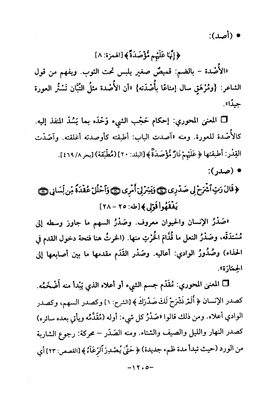 Qمُقَدّم جسم الشيء أو أعلاه الذي يَبْدأ منه أَضْخَمُه. كصدر الإنسان {أَلَمْ نَشْرَحْ لَكَ صَدْرَكَ} [الشرح: 1] وكصدر السهم، وكصدر الوادي أعلاه. ومن ذلك قالوا "صَدْرُ كل شيء: أوله (مُقَدَّمُه ويأتي بعده سائره) كصدر النهار والليل والصيف والشتاء. ومنه الصَدَر -محركة: رجوع الشاربة من الورد (حيث تبدأ مدة ظمء جديدة) {حَتَّى يُصْدِرَ الرِّعَاءُ} [القصص: 23] أي