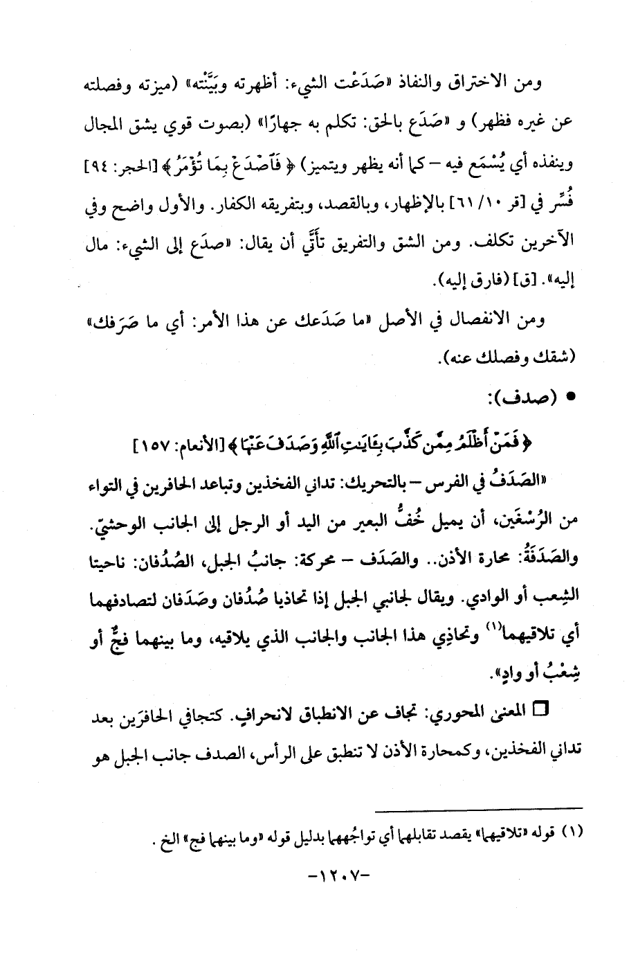 "الصَدَفُ في الفرس -بالتحريك: تداني الفخذين وتباعد الحافرين في التواء من الرُسْغَين، أن يميل خُفُّ البعير من اليد أو الرجل إلى الجانب الوحشيّ. والصَدَفَةُ: محارة الأذن. . والصَدَف -محركة: جانبُ الجبل، الصُدُفان: ناحيتا الشِعب أو الوادي. ويقال لجانبي الجبل إذا تحاذيا صُدُفان وصَدَفان لتصادفهما أي تلاقيهما (¬1) وتحاذِي هذا الجانب والجانب الذي يلاقيه، وما بينهما فجٌّ أو شِعْبُ أو وادٍ ".