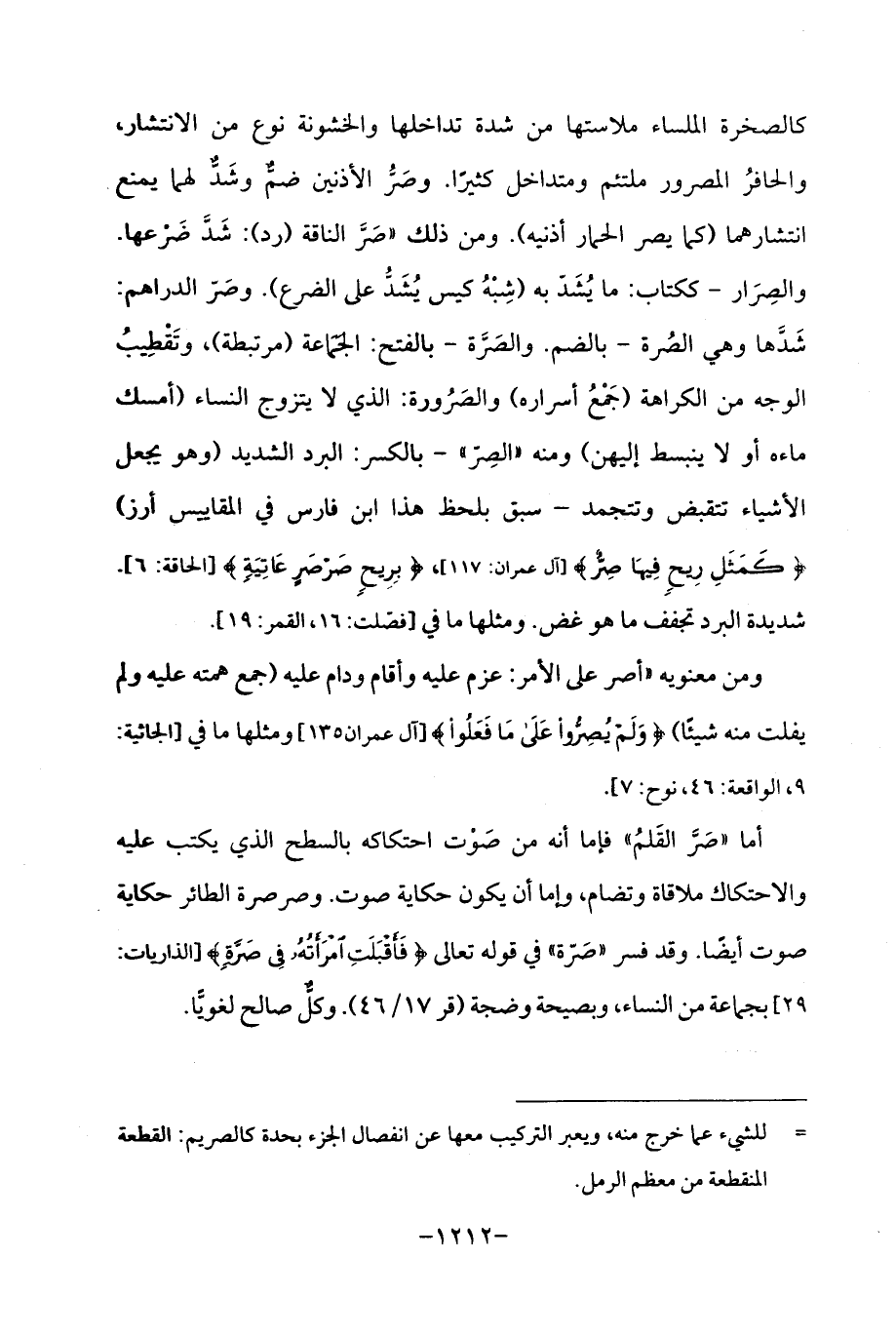 كالصخرة الملساء ملاستها من شدة تداخلها والخشونة نوع من الانتشار، والحافرُ المصرور ملتئم ومتداخل كثيرًا. وصَرُّ الأذنين ضمٌّ وشَدٌّ لهما يمنع انتشارهما (كما يصر الحمار أذنيه). ومن ذلك "صَرَّ الناقة (رد): شَدَّ ضَرْعها. والصِرَار -ككتاب: ما يُشَدّ به (شِبْهُ كيس يُشَدُّ على الضرع). وصَرّ الدراهم: شَدَّها وهي الصُرة -بالضم. والصَرَّة -بالفتح: الجَمَاعة (مرتبطة)، وتَقْطِيبُ الوجه من الكراهة (جَمْعُ أسراره) والصَرُورة: الذي لا يتزوج النساء (أمسك ماءه أو لا ينبسط إليهن) ومنه "الصِرّ "-بالكسر: البرد الشديد (وهو يجعل الأشياء تتقبض وتتجمد - سبق بلحظ هذا ابن فارس في المقاييس أرز) {كَمَثَلِ رِيحٍ فِيهَا صِرٌّ} [آل عمران: 117]، {بِرِيحٍ صَرْصَرٍ عَاتِيَةٍ} [الحاقة: 6]. شديدة البرد تجفف ما هو غض. ومثلها ما في [فصّلت: 16، القمر: 19].