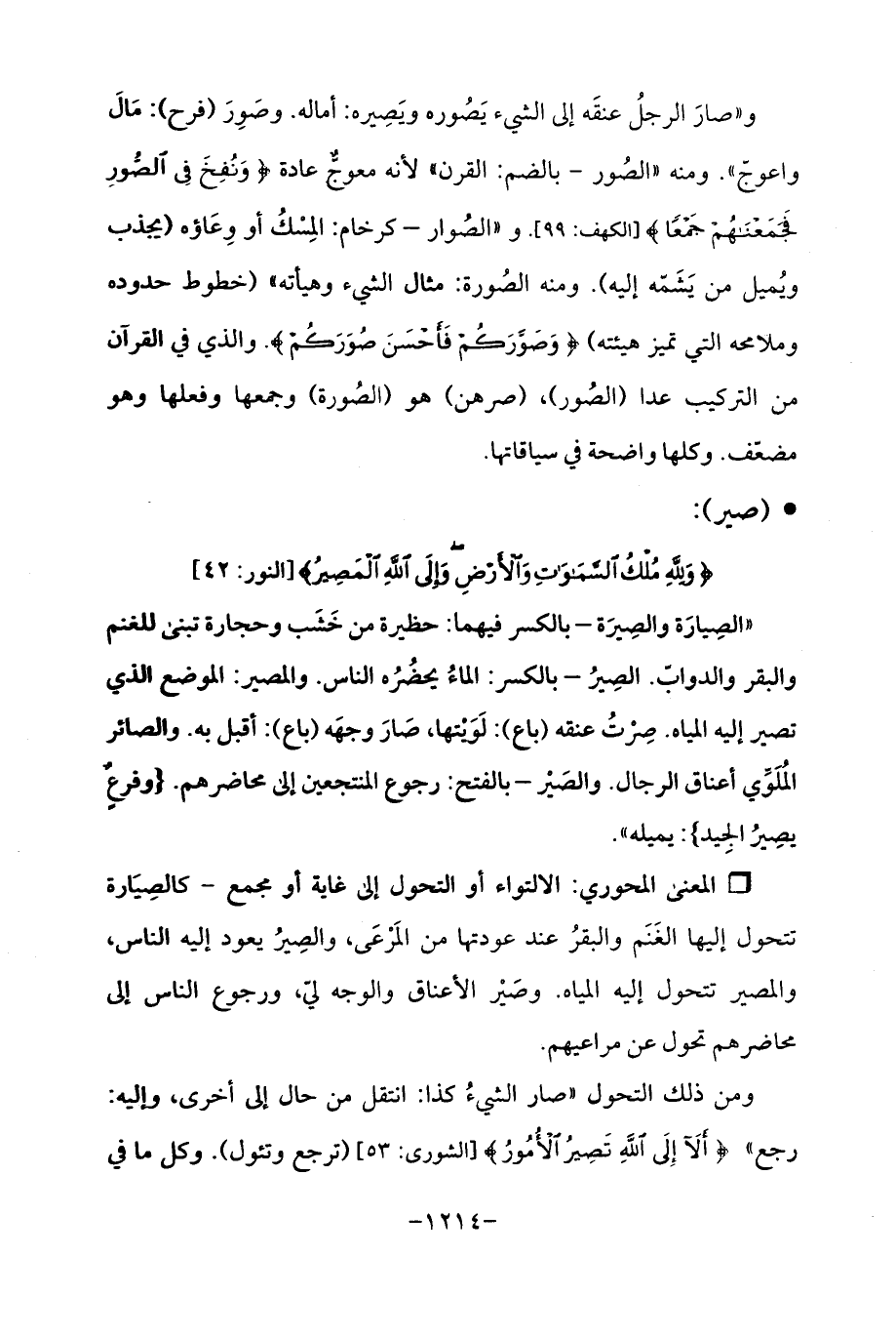 ومن ذلك التحول "صار الشيءُ كذا: انتقل من حال إلى أخرى، وإليه: رجع " {أَلَا إِلَى اللَّهِ تَصِيرُ الْأُمُورُ} [الشورى: 53] (ترجع وتئول). وكل ما في
