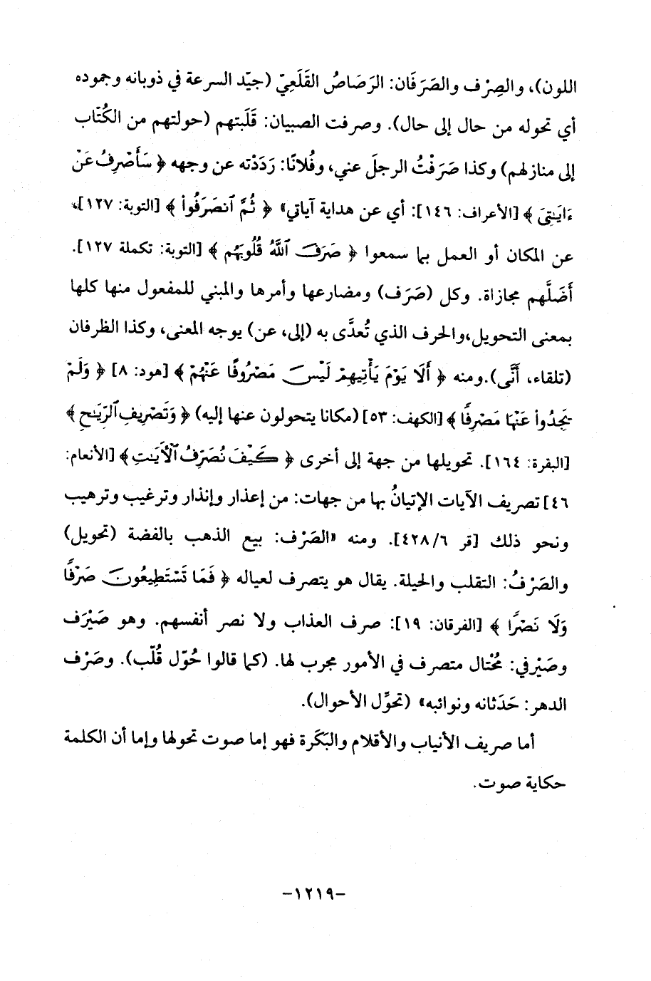 اللون)، والصِرْف والصَرَفَان: الرَصَاصُ القَلَعِيّ (جيّد السرعة في ذوبانه وجموده أي تحوله من حال إلى حال). وصرفت الصبيان: قَلَبتهم (حولتهم من الكُتّاب إلى منازلهم) وكذا صَرَفْتُ الرجلَ عني، وفُلانًا: رَدَدْته عن وجهه {سَأَصْرِفُ عَنْ آيَاتِيَ} [الأعراف: 146]: أي عن هداية آياتي " {ثُمَّ انْصَرَفُوا} [التوبة: 127]، عن المكان أو العمل بما سمعوا {صَرَفَ اللَّهُ قُلُوبَهُمْ} [التوبة: تكملة 127]. أَضَلَّهم مجازاة. وكل (صَرَف) ومضارعها وأمرها والمبني للمفعول منها كلها بمعنى التحويل، والحرف الذي تُعدَّى به (إلى، عن) يوجه المعنى، وكذا الظرفان (تلقاء، أَنَّى). ومنه {أَلَا يَوْمَ يَأْتِيهِمْ لَيْسَ مَصْرُوفًا عَنْهُمْ} [هود: 8] {وَلَمْ يَجِدُوا عَنْهَا مَصْرِفًا} [الكهف: 53] (مكانا يتحولون عنها إليه) {وَتَصْرِيفِ الرِّيَاحِ} [البقرة: 164]. تحويلها من جهة إلى أخرى {كَيْفَ نُصَرِّفُ الْآيَاتِ} [الأنعام: 46] تصريف الآيات الإتيانُ بها من جهات: من إعذار وإنذار وترغيب وترهيب ونحو ذلك [قر 6/ 428]. ومنه "الصَرْف: بيع الذهب بالفضة (تحويل) والصَرْفُ: التقلب والحيلة. يقال هو يتصرف لعياله {فَمَا تَسْتَطِيعُونَ صَرْفًا وَلَا نَصْرًا} [الفرقان: 19]: صرف العذاب ولا نصر أنفسهم. وهو صَيْرَف وصَيْرفي: مُحْتال متصرف في الأمور مجرب لها. (كما قالوا حُوّل قُلّب). وصَرْف الدهر: حَدَثانه ونوائبه " (تحوِّل الأحوال).