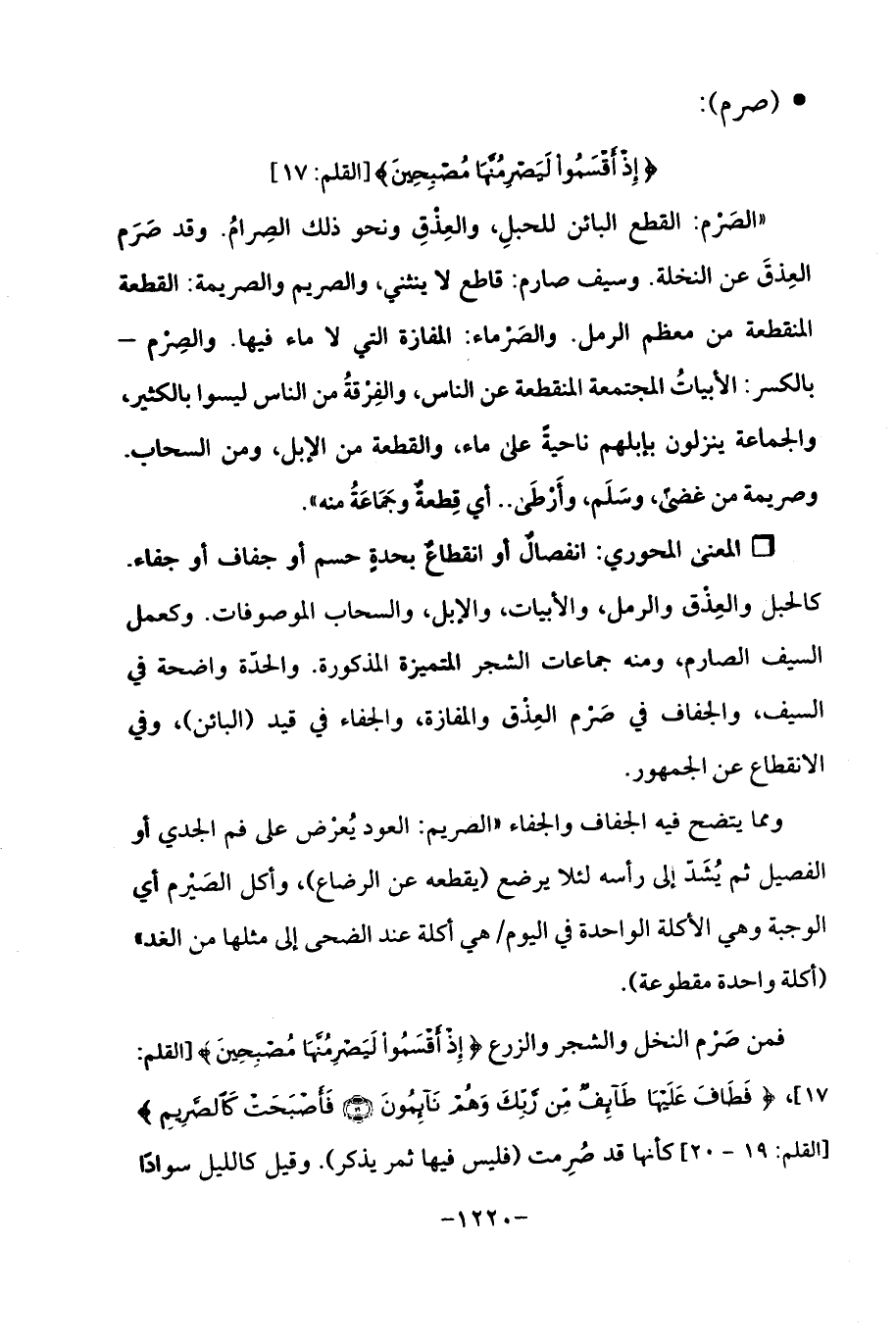 فمن صَرْم النخل والشجر والزرع {إِذْ أَقْسَمُوا لَيَصْرِمُنَّهَا مُصْبِحِينَ} [القلم: 17] {فَطَافَ عَلَيْهَا طَائِفٌ مِنْ رَبِّكَ وَهُمْ نَائِمُونَ (19) فَأَصْبَحَتْ كَالصَّرِيمِ} [القلم: 19 - 20] كأنها قد صُرِمت (فليس فيها ثمر يذكر). وقيل كالليل سوادًا