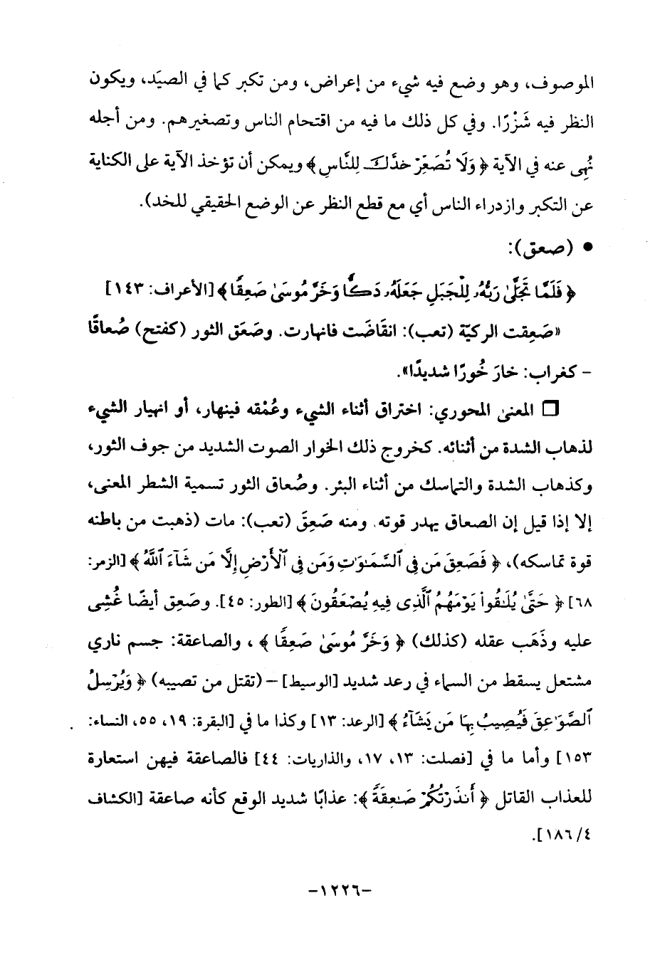 Qاختراق أثناء الشيء وعُمْقه فينهار، أو انهيار الشيء لذهاب الشدة من أثنائه. كخروج ذلك الخوار الصوت الشديد من جوف الثور، وكذهاب الشدة والتماسك من أثناء البئر. وصُعاق الثور تسمية الشطر المعنى، إلا إذا قيل إن الصعاق يهدر قوته. ومنه صَعِقَ (تعب): مات (ذهبت من باطنه قوة تماسكه)، {فَصَعِقَ مَنْ فِي السَّمَاوَاتِ وَمَنْ فِي الْأَرْضِ إِلَّا مَنْ شَاءَ اللَّهُ} [الزمر: 68] {حَتَّى يُلَاقُوا يَوْمَهُمُ الَّذِي فِيهِ يُصْعَقُونَ} [الطور: 45]. وصَعِق أيضًا غُشِى عليه وذَهَب عقله (كذلك) {وَخَرَّ مُوسَى صَعِقًا}، والصاعقة: جسم ناري مشتعل يسقط من الماء في رعد شديد [الوسيط]- (تقتل من تصيبه) {وَيُرْسِلُ الصَّوَاعِقَ فَيُصِيبُ بِهَا مَنْ يَشَاءُ} [الرعد: 13] وكذا ما في [البقرة: 19، 55، النساء: 153] وأما ما في [فصلت: 13، 17، والذاريات: 44] فالصاعقة فيهن استعارة للعذاب القاتل {أَنْذَرْتُكُمْ صَاعِقَةً}: عذابًا شديد الوقع كأنه صاعقة [الكشاف 4/ 186].