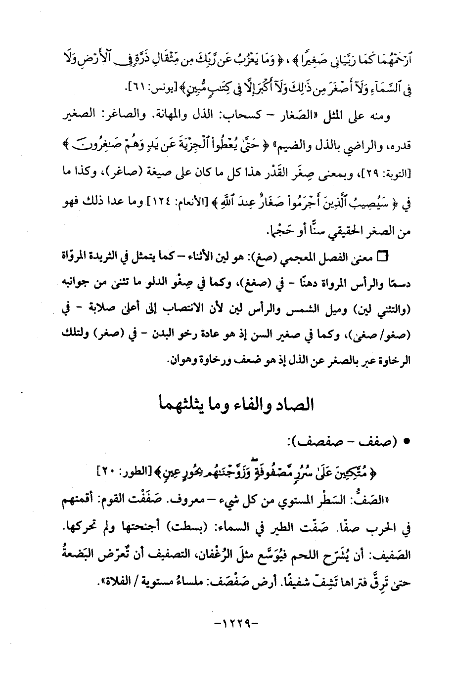 ° معنى الفصل المعجمي (صغ): هو بين الأثناء -كما يتمثل في الثريدة المروّاة دسمًا والرأس المرواة دهنًا -في (صغغ)، وكما في صِغْو الدلو ما تثنى من جوانبه (والتثني لين) وميل الشمس والرأس لين لأن الانتصاب إلى أعلى صلابة -في (صغو/ صغى)، وكما في صغير السن إذ هو عادة رخو البدن -في (صغر) ولتلك الرخاوة عبر بالصغر عن الذل إذ هو ضعف ورخاوة وهوان.