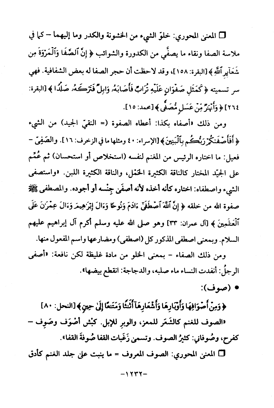 Qخلوّ الشيء من الخشونة والكدر وما إليهما -كما في ملاسة الصفا ونقاء ما يصفَّي من الكدورة والشوائب {إِنَّ الصَّفَا وَالْمَرْوَةَ مِنْ شَعَائِرِ اللَّهِ} [البقرة: 158]، وقد لاحظت أن حجر الصفا له بعض الشفافية. فهي سر تسميته {كَمَثَلِ صَفْوَانٍ عَلَيْهِ تُرَابٌ فَأَصَابَهُ وَابِلٌ فَتَرَكَهُ صَلْدًا} [البقرة: 264] {وَأَنْهَارٌ مِنْ عَسَلٍ مُصَفًّى} [محمد: 15].