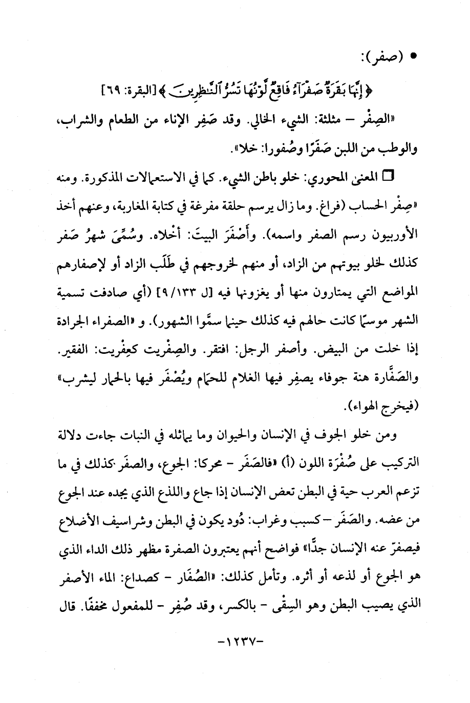 Qخلو باطن الشيء. كما في الاستعمالات المذكورة. ومنه "صِفْر الحساب (فراغ. وما زال يرسم حلقة مفرغة في كتابة المغاربة، وعنهم أخذ الأوربيون رسم الصفر واسمه). وأَصْفَرَ البيتَ: أخْلاه. وسُمِّىَ شهرُ صَفر كذلك لخلو بيوتهم من الزاد، أو منهم لخروجهم في طَلَب الزاد أو لإصفارهم المواضع التي يمتارون منها أو يغزونها فيه [ل 133/ 9] (أي صادفت تسمية الشهر موسمًا كانت حالهم فيه كذلك حينما سمَّوا الشهور). و "الصفراء الجرادة إذا خلت من البيض. وأصفر الرجل: افتقر. والصِفْريت كعِفْريت: الفقير. والصَفَّارة هنة جوفاء يصفِر فيها الغلام للحمَام ويُصْفَر فيها بالحمار ليشرب " (فيخرج الهواء).