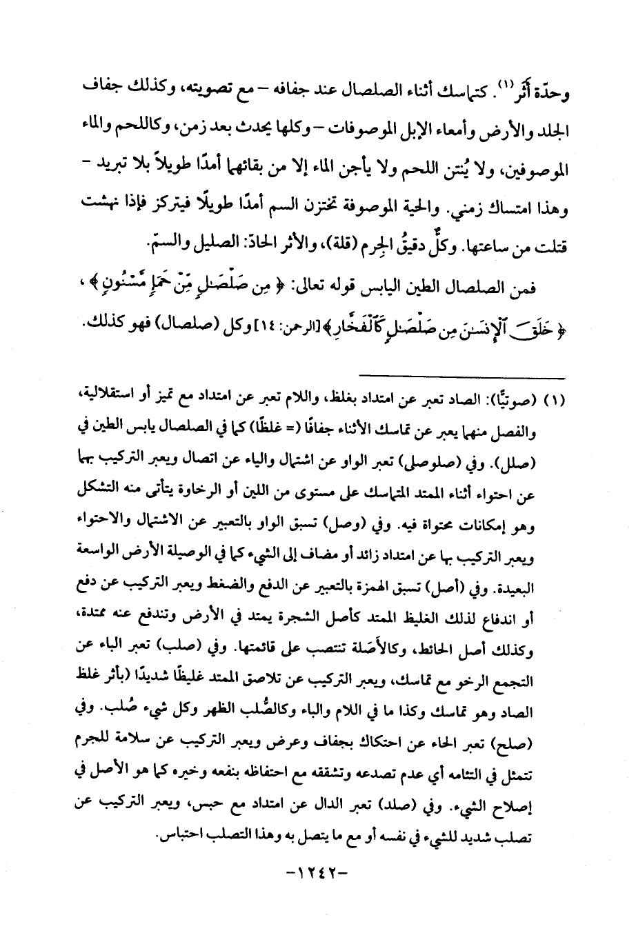 (¬1) (صوتيًّا): الصاد تعبر عن امتداد بغلظ، واللام تعبر عن امتداد مع تميز أو استقلالية، والفصل منهما يعبر عن تماسك الأثناه جفافًا (= غلظًا) كما في الصلصال يابس الطين في (صلل). وفي (صلوصلى) تعبر الواو عن اشتمال والياء عن اتصال ويعبر التركيب بهما عن احتواء اثناء الممتد المتماسك على مستوى من اللين أو الرخاوة يتأتى منه التشكل وهو إمكانات محتواة فيه. وفي (وصل) تسبق الواو بالتعبير عن الاشتمال والاحتواء ويعبر التركيب بها عن امتداد زائد أو مضاف إلى الشيء كما في الوصيلة الأرض الواسعة البعيدة. وفي (أصل) تسبق الهمزة بالتعبير عن الدفع والضغط ويعبر التركيب عن دفع أو اندفاع لذلك الغليظ الممتد كأصل الشجرة يمتد في الأرض وتندفع عنه ممتدة، وكذلك أصل الحائط، وكالأَصَلة تنتصب على قائمتها. وفي (صلب) تعبر الباء عن التجمع الرخو مع تماسك، ويعبر التركيب عن تلاصق الممتد غليظًا شديدًا (بأثر غلظ الصاد وهو تماسك وكذا ما في اللام والباء وكالصُّلب الظهر وكل شيء صُلب. وفي (صلح) تعبر الحاء عن احتكاك بجفاف وعرض ويعبر التركيب عن سلامة للجرم تتمثل في التئامه أي عدم تصدعه وتشققه مع احتفاظه بنفعه وخيره كما هو الأصل في إصلاح الشيء. وفي (صلد) تعبر الدال عن امتداد مع حبس، ويعبر التركيب عن تصلب شديد للشيء في نفسه او مع ما تصل به وهذا التصلب احتباس.