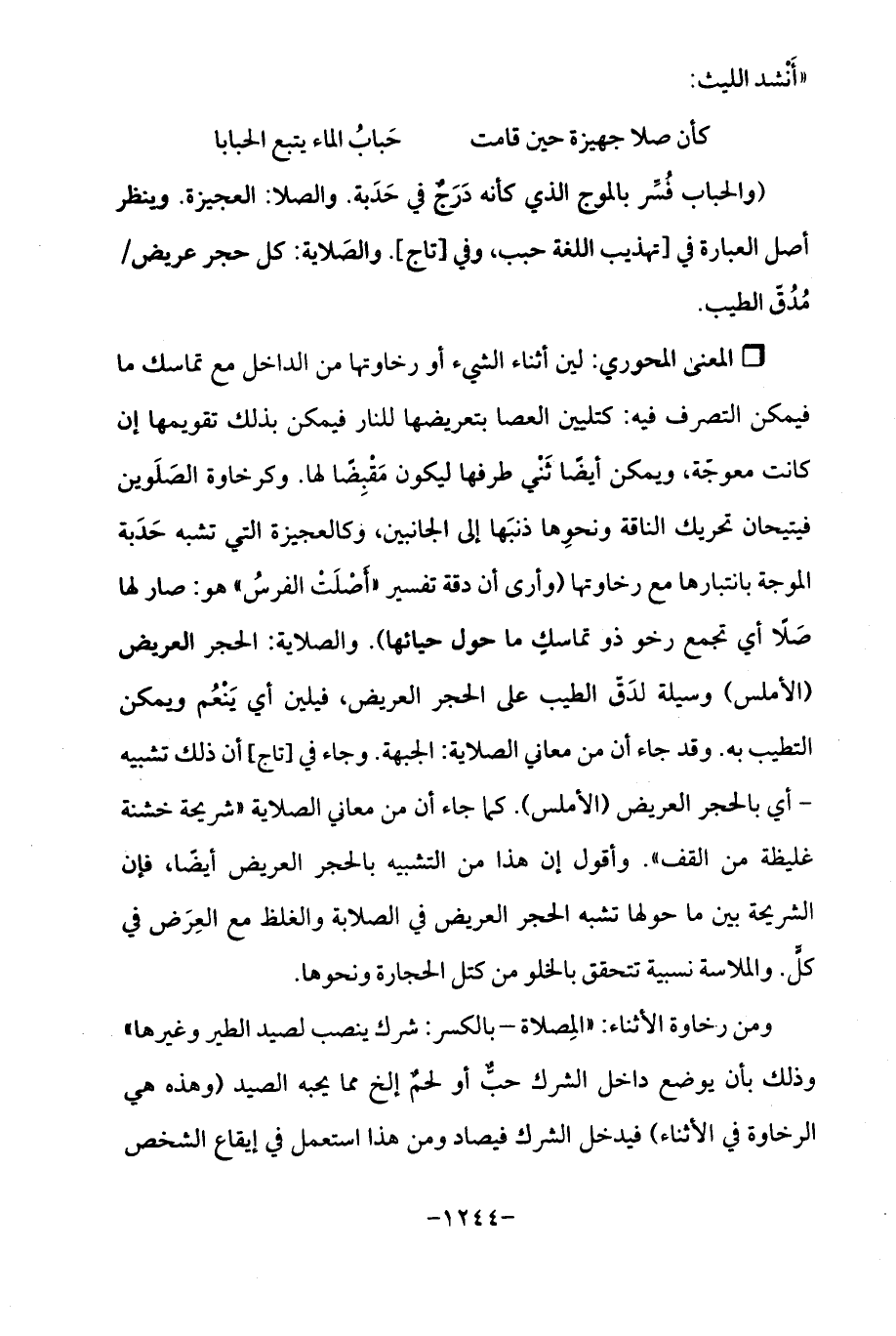 Qلين أثناء الشيء أو رخاوتها من الداخل مع تماسك ما فيمكن التصرف فيه: كتليين العصا بتعريضها للنار فيمكن بذلك تقويمها إن كانت معوجّة، ويمكن أيضًا ثَنْي طرفها ليكون مَقْبِضًا لها. وكرخاوة الصَلَوين فيتيحان تحريك الناقة ونحوِها ذنبَها إلى الجانبين، وكالعجيزة التي تشبه حَدَبة الموجة بانتبارها مع رخاوتها (وأرى أن دقة تفسير "أَصْلَت الفرسُ "هو: صار لها صَلًا أي تجمع رخو ذو تماسكِ ما حول حيائها). والصلاية: الحجر العريض (الأملس) وسيلة لدَقّ الطيب على الحجر العريض، فيلين أي يَنْعُم ويمكن التطيب به. وقد جاء أن من معاني الصلاية: الجبهة. وجاء في [تاج] أن ذلك تشبيه -أي بالحجر العريض (الأملس). كما جاء أن من معاني الصلاية "شريحة خشنة غيظة من القف ". وأقول إن هذا من الشبيه بالحجر العريض أيضًا، فإن الشريحة بين ما حولها تشبه الحجر العريض في الصلابة والغلظ مع العِرَض في كلٍّ. والملاسة نسبية تتحقق بالخلو من كتل الحجارة ونحوها.