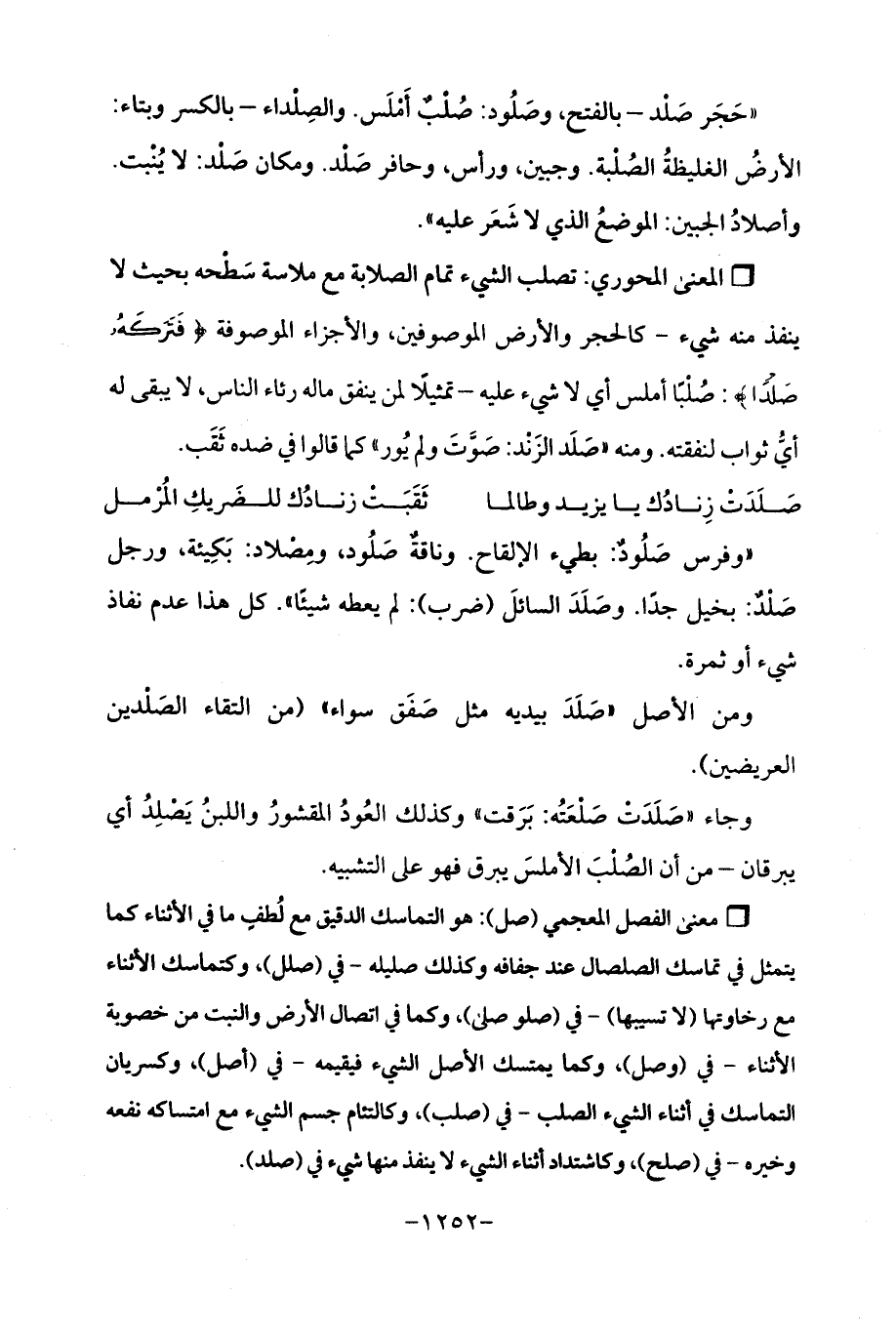 "حَجَر صَلْد -بالفتح، وصَلُود: صُلْبٌ أَمْلَس. والصِلْداء -بالكسر وبتاء: الأرضُ الغليظةُ الصُلْبة. وجبين، ورأس، وحافر صَلْد. ومكان صَلْد: لا يُنْبت. وأصلادُ الجبين: الموضعُ الذي لا شَعَر عليه ".