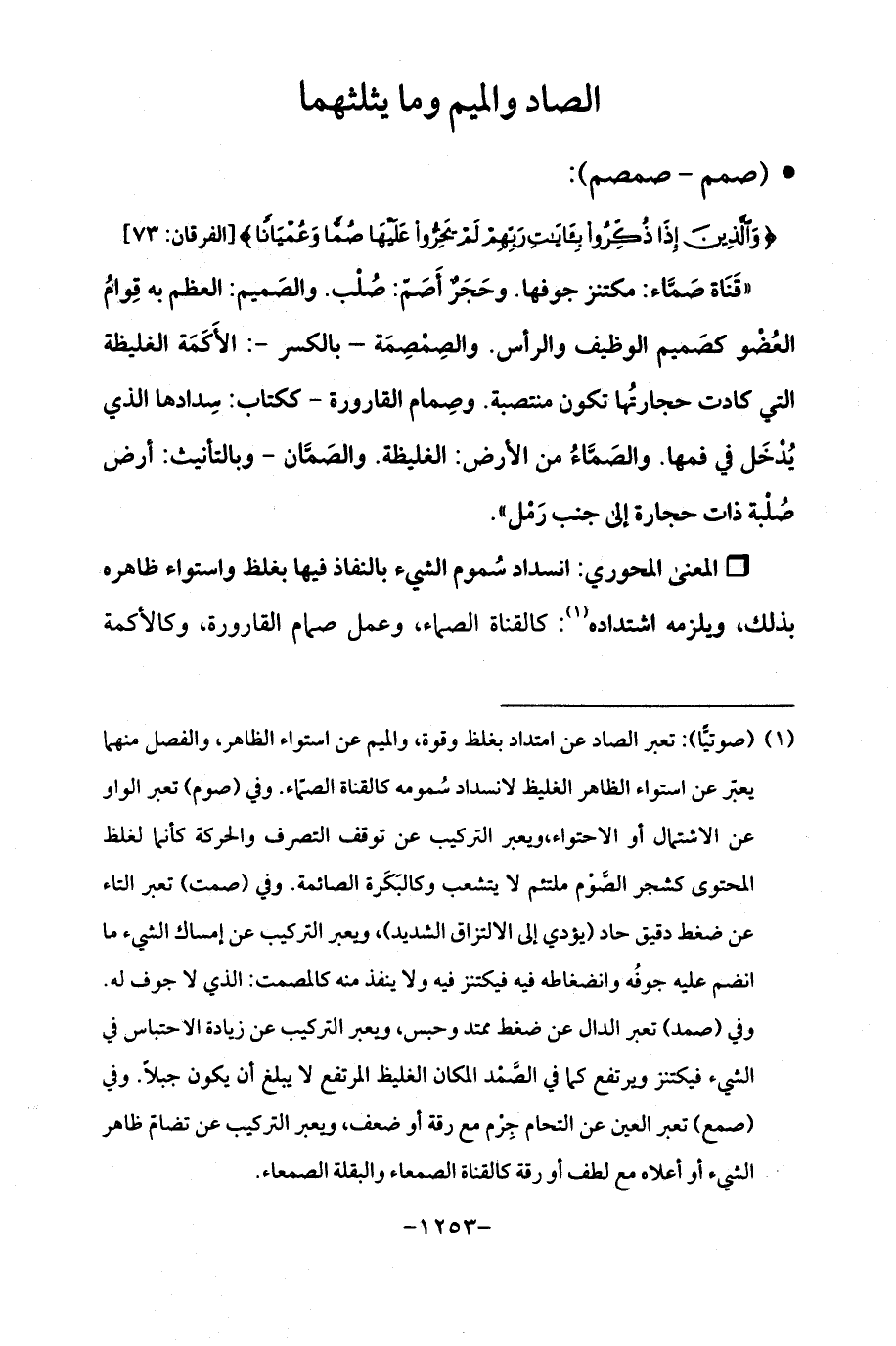 (¬1) (صوتيًّا): تعبر الصاد عن امتداد بغلظ وقوة، والميم عن استواء الظاهر، والفصل منهما يعبّر عن استواء الظاهر الغليظ لانسداد سُمومه كالقناة الصمّاء. وفي (صوم) تعبر الواو عن الاشتمال أو الاحتواء، ويعبر التركيب عن توقف التصرف والحركة كأنما لغلظ المحتوى كشجر الصَّوْم ملتئم لا يتشعب وكالبَكَرة الصائمة. وفي (صمت) تعبر التاء عن ضغط دقيق حاد (يؤدي إلى الالتزاق الشديد)، ويعبر التركيب عن إمساك الشيء ما انضم عليه جوفُه وانضغاطه فيه فيكتنز فيه ولا ينفذ منه كالمصمت: الذي لا جوف له. وفي (صمد) تعبر الدال عن ضغط ممتد وحبس، ويعبر التركيب عن زيادة الاحتباس في الشيء فيكتنز ويرتفع كما في الصَّمْد المكان الغليظ المرتفع لا يبلغ ان يكون جبلًا. وفي (صمع) تعبر العين عن التحام جِرْم مع رقة أو ضعف، ويعبر التركيب عن تضامّ ظاهر الشيء أو أعلاه مع لطف أو رقة كالقناة الصمعاء والبقلة الصمعاء.