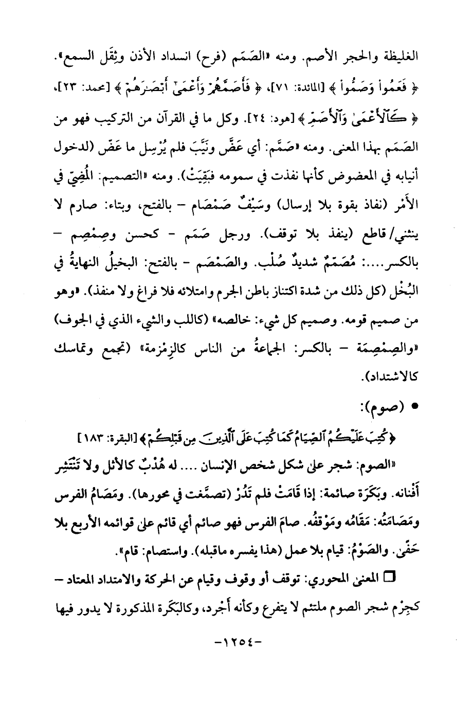 "الصوم: شجر على شكل شخص الإنسان. . . له هُدْبٌ كالأثل ولا تَنْتَشِر أَفْنانه. وبَكَرَة صائمة: إذا قَامَت فلم تَدُرْ (تصمَّغت في محورها). ومَصَامُ الفرس ومَصَامَتُه: مَقَامُه ومَوقفُه. صامَ الفرس فهو صائم أي قائم على قوائمه الأربع بلا حَفًى. والصَوْمُ: قيام بلا عمل (هذا يفسره ما قبله). واستصام: قام ".