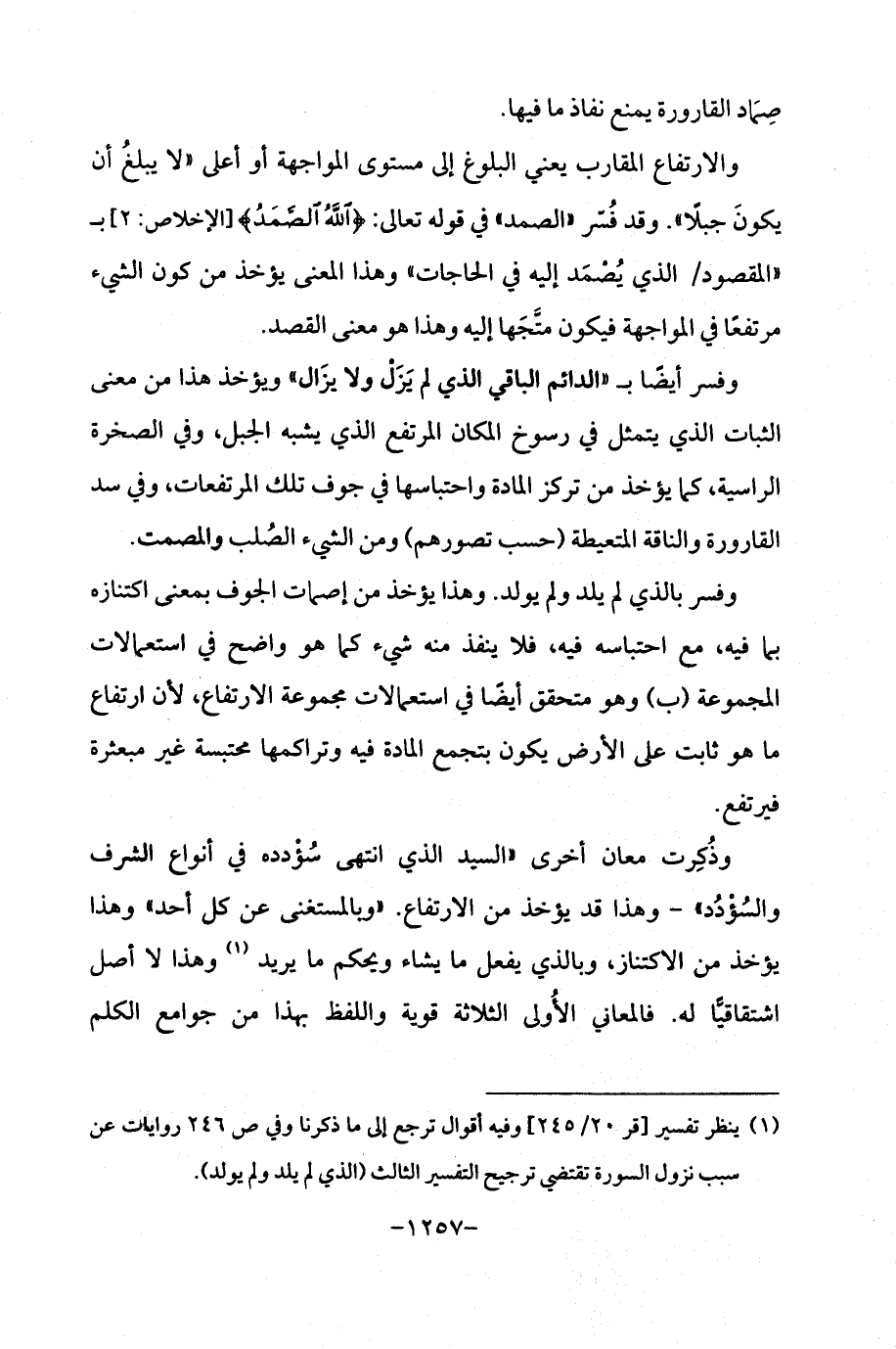 وذُكِرت معان أخرى "السيد الذي انتهى سُؤْدده في أنواع الشرف والسُؤدُد "-وهذا قد يؤخذ من الارتفاع. "وبالمستغنى عن كل أحد "وهذا يؤخذ من الاكتناز، وبالذي يفعل ما يشاء ويحكم ما يريد (¬1) وهذا لا أصل اشتقاقيًّا له. فالمعاني الأُولى الثلاثة قوية واللفظ بهذا من جوامع الكلم