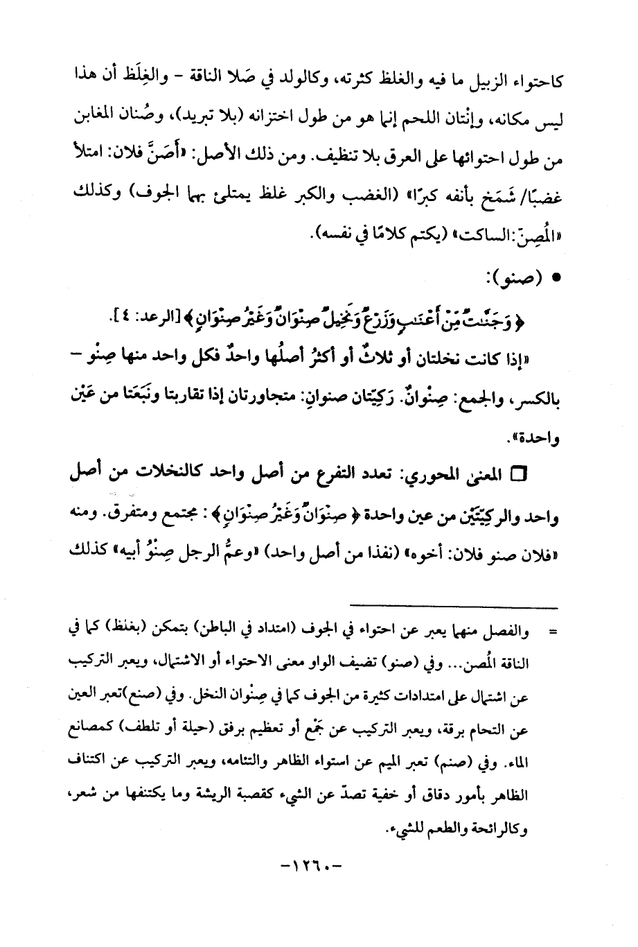 = والفصل منهما يعبر عن احتواء في الجوف (امتداد في الباطن) بتمكن (بغلظ) كما في الناقة الُمصن. . . وفي (صنو) تضيف الواو معنى الاحتواء أو الاشتمال، ويعبر التركيب عن اشتمال على امتدادات كثيرة من الجوف كما في صِنْوان النخل. وفي (صنع) تعبر العين عن التحام برقة، ويعبر التركيب عن جَمْع أو تعظيم برفق (حيلة أو تلطف) كمصانع الماء. وفي (صنم) تعبر الميم عن استواء الظاهر والتئامه، ويعبر التركيب عن اكتناف الظاهر بأمور دقاق أو خفية تصدّ عن الشيء كقصبة الريشة وما يكتنفها عن شعر، وكالرائحة والطعم للشيء.