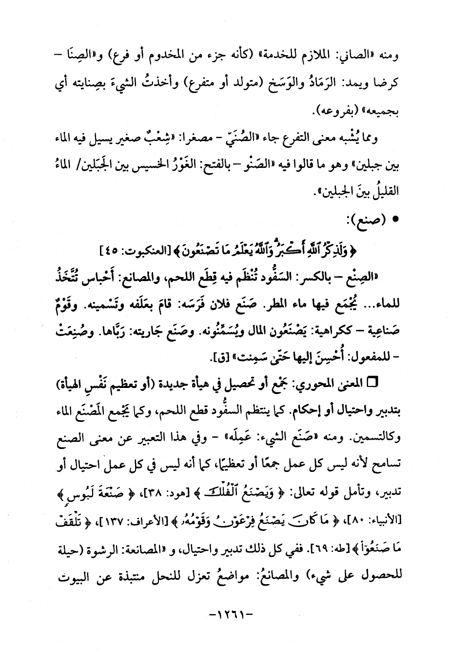 Qجَمْع أو تحصيل في هيأة جديدة (أو تعظيم نَفْسِ الهيأة) بتدبير واحتيال أو إحكام. كما ينتظم السفُّود قطع اللحم، وكما يَجْمع المَصْنَع الماء وكالتسمين. ومنه "صَنَع الشيء: عَمِلَه "-وفي هذا التعبير عن معنى الصنع تسامح لأنه ليس كل عمل جمعًا أو تعظيمًا، كما أنه ليس في كل عمل احتيال أو تدبير، وتأمل قوله تعالى: {وَيَصْنَعُ الْفُلْكَ} [هود: 38]، {صَنْعَةَ لَبُوسٍ} [الأنبياء: 80]، {مَا كَانَ يَصْنَعُ فِرْعَوْنُ وَقَوْمُهُ} [الأعراف: 137]، {تَلْقَفْ مَا صَنَعُوا} [طه: 69]. ففي كل ذلك تدبير واحتيال، و "المصانعة: الرشوة (حيلة للحصول على شيء) والمصانعُ: مواضعُ تعزل للنحل منتبذة عن البيوت