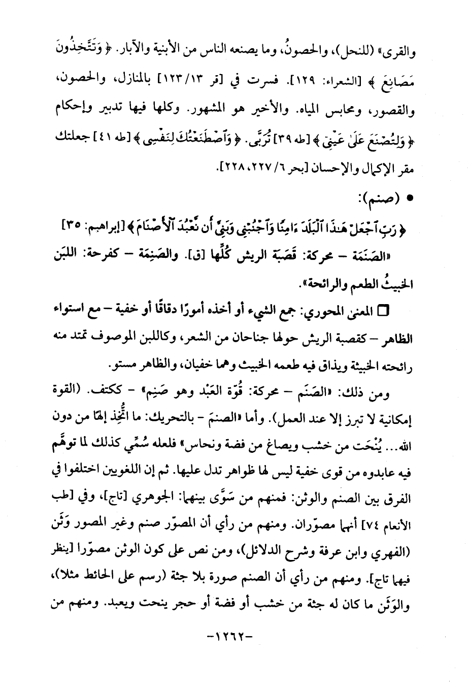 ومن ذلك: "الصَنَم -محركة: قُوّة العَبْد وهو صَنِم "- ككتف. (القوة إمكانية لا تبرز إلا عند العمل). وأما "الصنمَ -بالتحريك: ما اتُّخِذ إلهًا من دون اللَّه. . . يُنْحَت من خشب ويصاغ من فضة ونحاس "فلعله سُمِّي كذلك لما توهَّم فيه عابدوه من قوى خفية ليس لها ظواهر تدل عليها. ثم إن اللغويين اختلفوا في الفرق بين الصنم والوثن: فمنهم من سَوَّى بينهما: الجوهري [تاج]، وفي [طب الأنعام 74] أنها مصوّران. ومنهم من رأي أن المصوّر صنم وغير المصور وَثَن (الفهري وابن عرفة وشرح الدلائل)، ومن نص على كون الوثن مصوّرا [ينظر فيهما تاج]. ومنهم من رأي أن الصنم صورة بلا جثة (رسم على الحائط مثلا)، والوَثَن ما كان له جثة من خشب أو فضة أو حجر ينحت ويعبد. ومنهم من