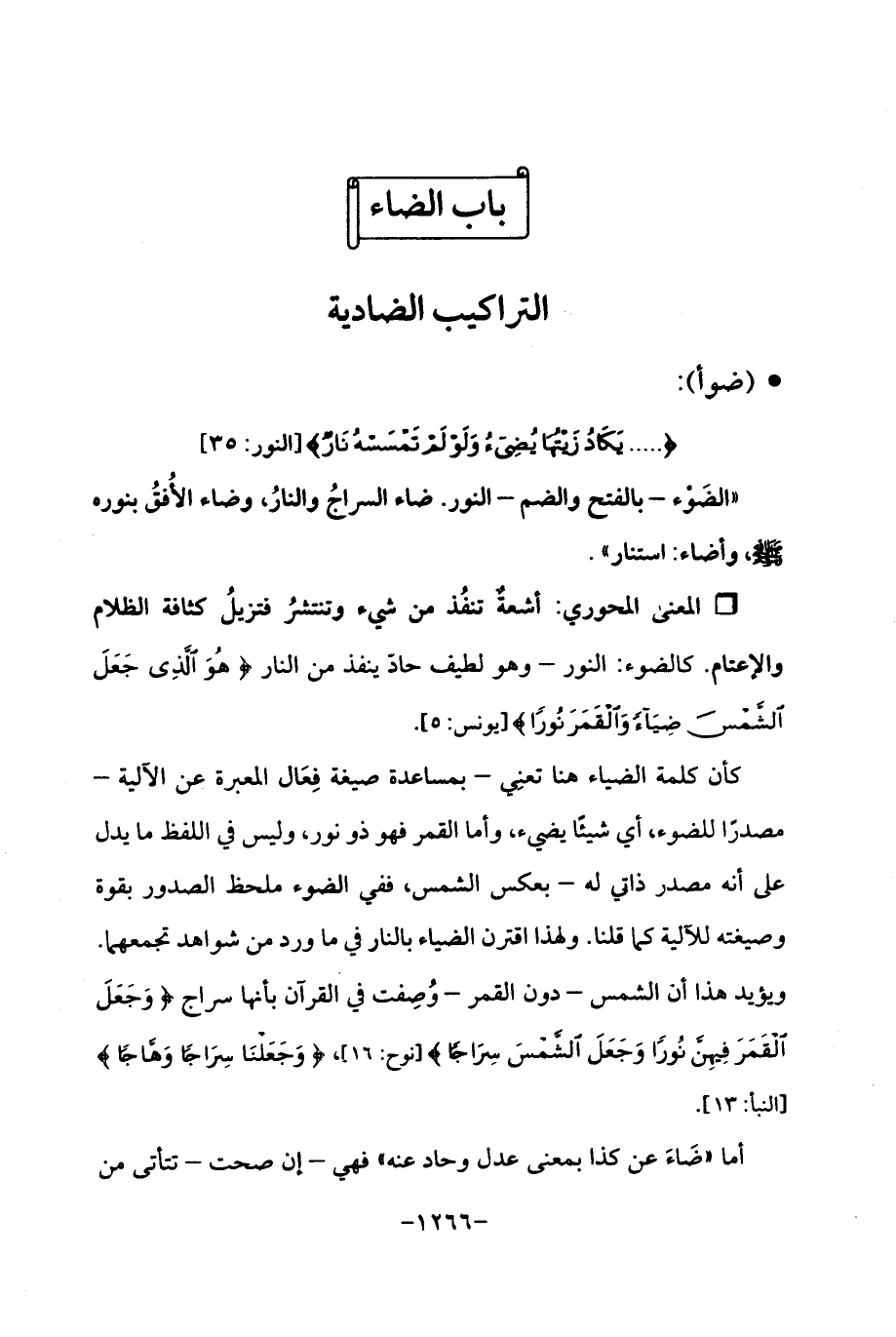 Qأشعةٌ تنفُذ من شيء وتنتشرُ فتزيلُ كثافة الظلام والإعتام. كالضوء: النور - وهو لطيف حادّ ينفذ من النار {هُوَ الَّذِي جَعَلَ الشَّمْسَ ضِيَاءً وَالْقَمَرَ نُورًا} [يونس: 5].